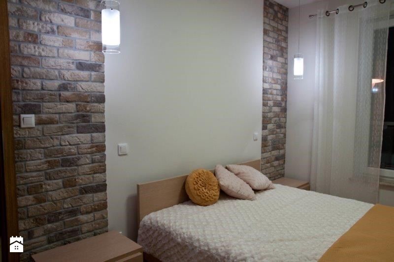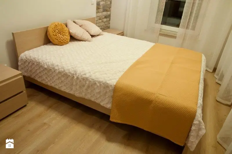 Dormitorul preia din cromatica din zona de zi, mizand pe minimalism. Finisajele ne atrag atentia, fiind si cele care imbogatesc textural camera. Depozitarea este incastrata pe peretele cu patul, in dulapuri fara manere (se deschid prin sistem push). Perdelele albe filtreaza placut lumina, fiind o solutie bine aleasa si in aceasta amenajare.