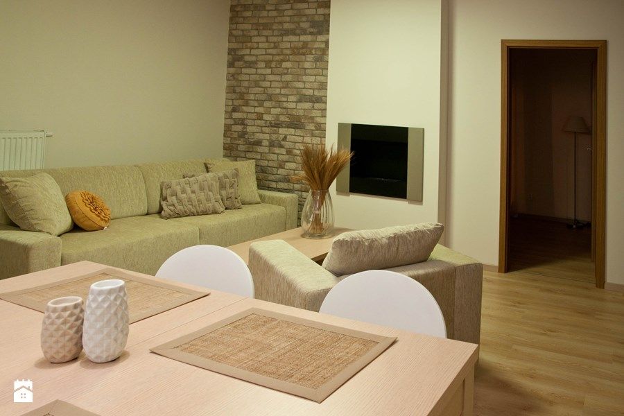 Pentru living, amenajarea este abordata minimal, cu accent pe texturi. Peretele-accent realizat din caramida aparenta contrasteaza cu lemnul pardoselii. Canapeaua, impreuna cu fotoliile si masuta de cafea compun un spatiu confortabil fie ca iti primesti oaspeti sau doresti sa citesti o carte.