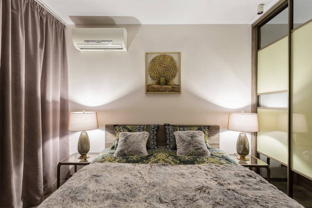 Pentru dormitor a fost conturata o amenajare menita sa-ti rasfete simturile. Bogatia de texturi, nuantele blande si calde precum si luminile difuze descriu un ambient confortabil, relaxant. Spatiul avut la dispozitie nu este mare, dar a permis integrarea unui dulap pentru haine, cu usi glisante si fatete cu oglinzi. Efectul de largire a spatiului este vizibil in special pe timpul zilei, cand oglinzile reflecta lumina naturala.