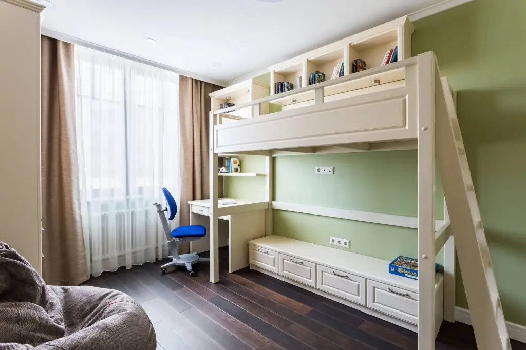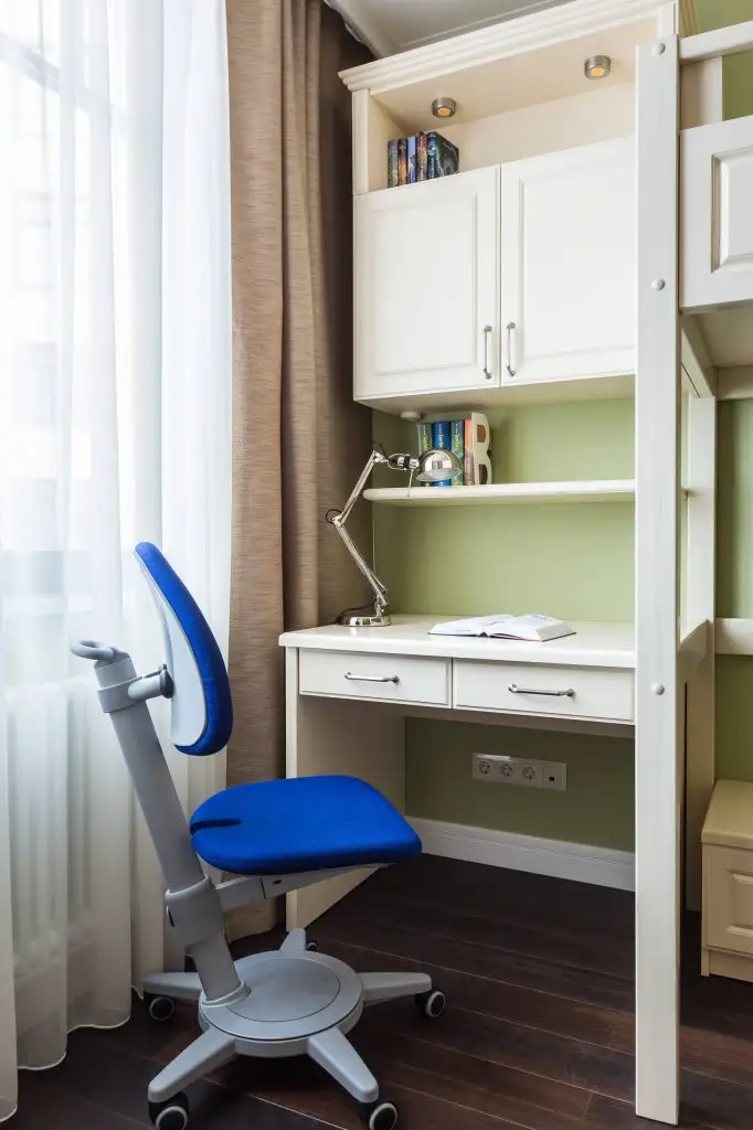 Spatiul generos al apartamentului face posibila aducerea in componenta sa a unei camere de tineret. Cu un design compact si practic, aceasta permite desfasurarea tuturor activitatilor zilnice intr-o maniera cat mai facila. Vorbim in acest caz de un set de mobilier ce incorporeaza un birou, o biblioteca si un pat suprapus.