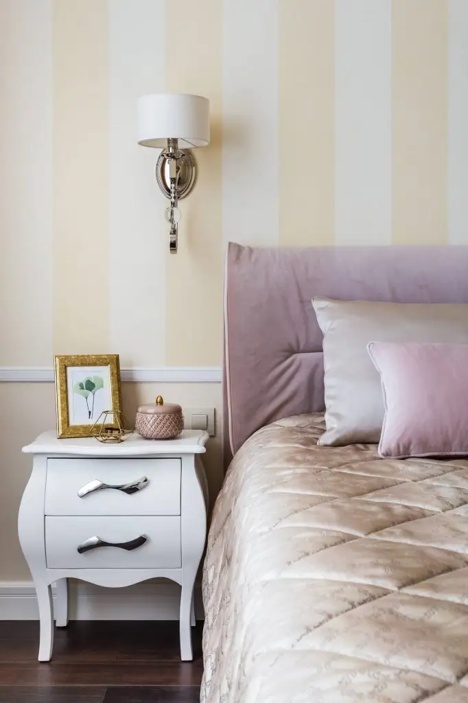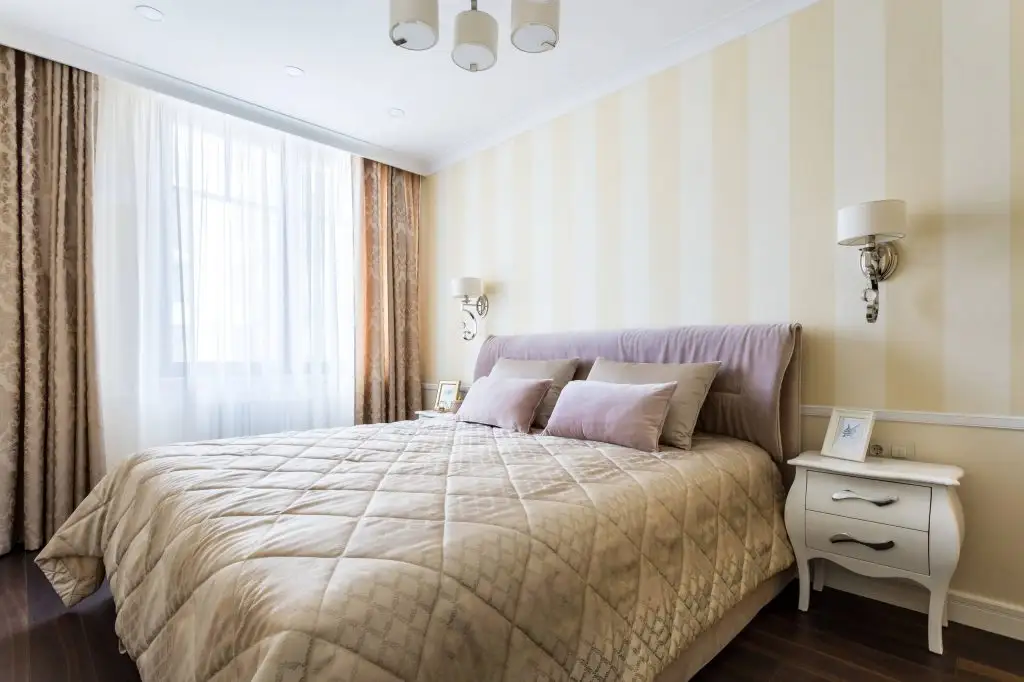 Cele doua dormitoare matrimoniale contureaza impreuna o atmosfera eleganta si romantica pozitionand central paturi duble cu cadre si tablii tapitate in stil clasic. Noptierele, corpurile de iluminat si tapetul scot in evidenta acccente medievale, iar nuantele pastelate si texturile de satin si catifea aduc rafinament intregii amenajari.
