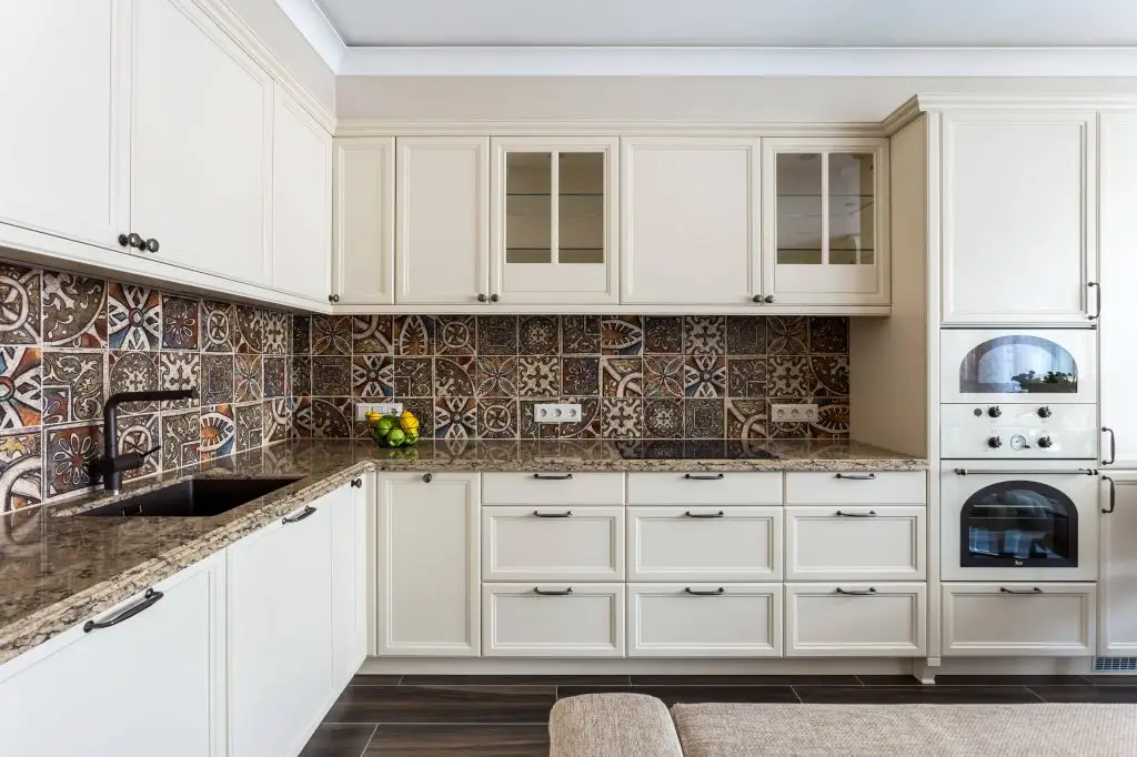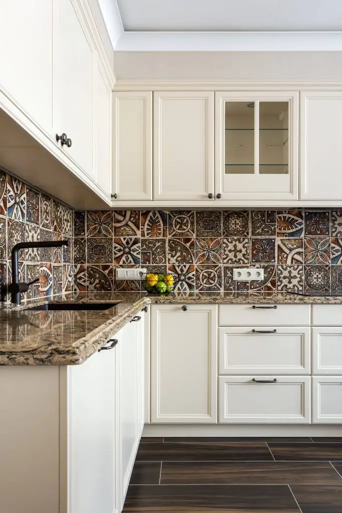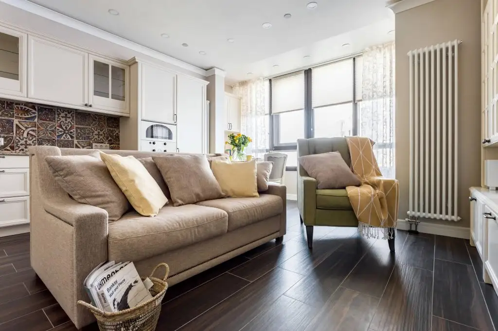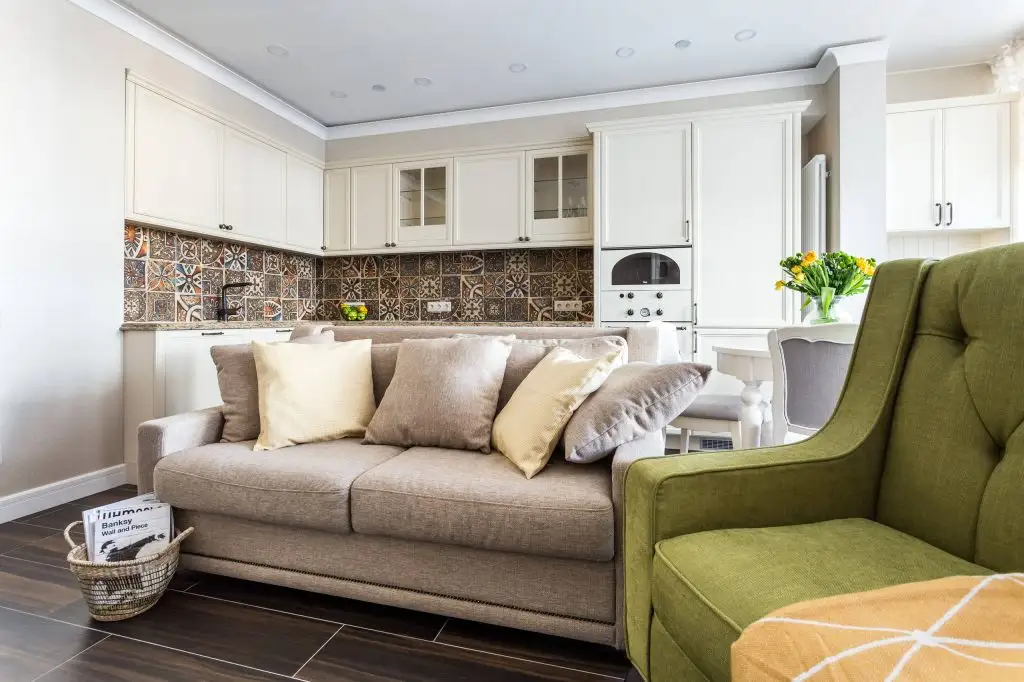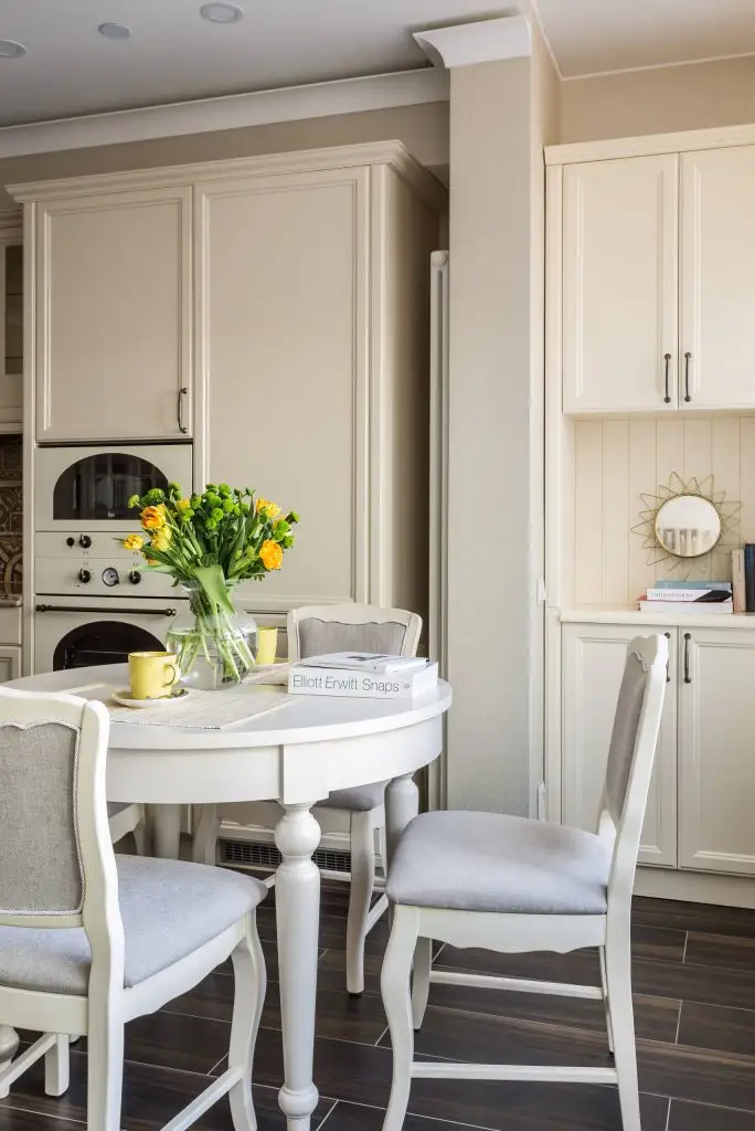 Electrocasnicele, desi dotate modern, se infatiseaza asemenea celor clasice iar impreuna cu placile de faianta aglomerate in ceea ce priveste modelul si zona de servire a mesei, aduc in prim-plan o amenajare retro. Spatiul dedicat relaxarii se imbina cu cea de pregatire si servire a mesei alaturand o biblioteca identica mobilierului bucatariei si o canapea cu un fotoliu in nuante pale.