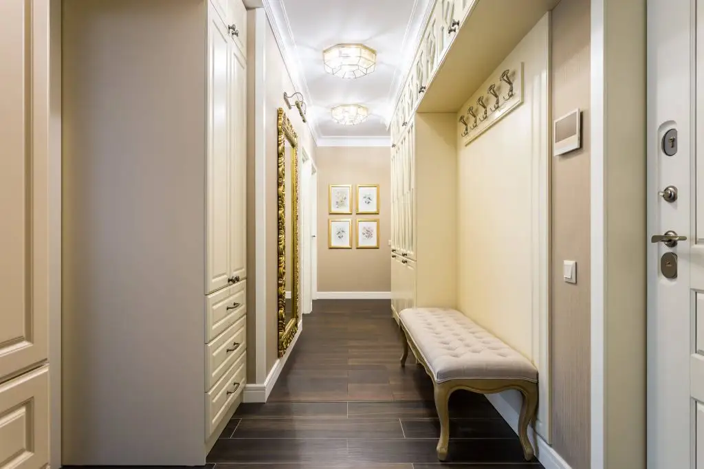 Ideea de grandoare se evidentiaza odata cu pasirea in incinta locuintei, unde holul de mari dimensiuni ia forma unei camere functionale, dotata cu spatii de depozitare si relaxare. Textura geometrica a mobilierului, design-ul accesoriilor, auriul si oglinda cu aspect medieval, aduc un aer vintage si elegant, marind totodata spatiul prin folosirea nuantelor pastelate si a lemnului natural.