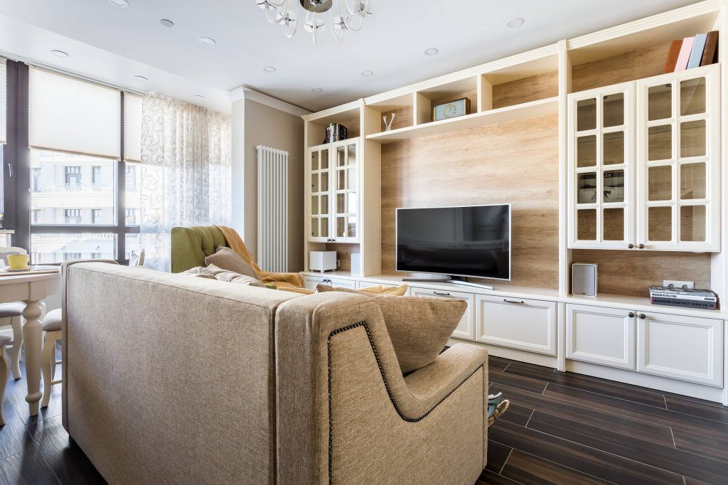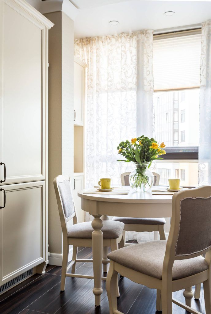 Electrocasnicele, desi dotate modern, se infatiseaza asemenea celor clasice iar impreuna cu placile de faianta aglomerate in ceea ce priveste modelul si zona de servire a mesei, aduc in prim-plan o amenajare retro. Spatiul dedicat relaxarii se imbina cu cea de pregatire si servire a mesei alaturand o biblioteca identica mobilierului bucatariei si o canapea cu un fotoliu in nuante pale.