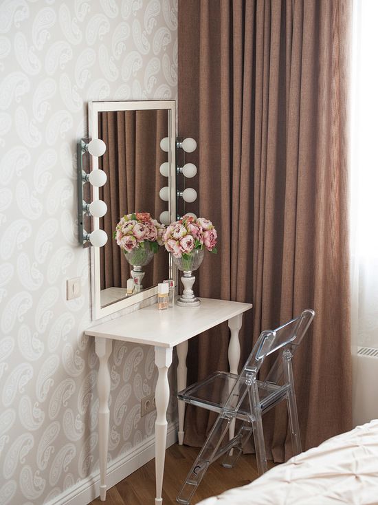 In dormitorul matrimonial, designerul a ales un decor in nuante neutre, calme, de crem, pana la maroul draperiilor. Elementele de accent nu lipsesc nici de aici. Asa cum in living avem un perete cu tapet si semineu fals, aici gasim un interesant detaliu cu obloane, un fel de ferestre false amenajat deasupra patului. Dorind sa creeze cat mai mult spatiu pentru depozitare, dulapul de haine se prelungeste printr-un corp suspendat deasupra usii de la intrarea in camera. Tot aici, a fost amenajat si un mic spatiu de lucru precum si un loc de infrumusetare cu o masuta-consola si o oglinda cu lumini tipice camerelor de machiaj. Decorul inspira un aer usor romantic prin designul si detaliile mobilierului.