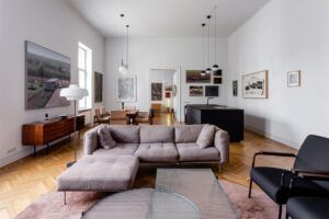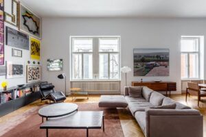 Spațiile principale de zi ale casei, adică primele două saloane istorice, au fost unite, astfel realizând un spațiu generos de expunere, care găzduiește atât livingul cât și bucătăria și locul de luat masa. Toate spațiile principale ale apartamentului sunt mobilate doar pâna la cota de înălțime de 1 metru, lăsând toți pereții liberi de mobilier înalt și pregătiți expunerii colecției de artă. În spiritul intervențiilor minimaliste arhitecturale (două cuburi albe, unul în hol, iar celălalt în dormitorul principal amenajat în ultimul salon), și piesele de mobilier sunt cât se poate de unitare și minimaliste, cu câteva accente din ale istoriei design-ului secolului X X. Bucătăria redusă la o singură insulă, și toate bibliotecile joase sunt niște volume simple, negre, un fundal neutru pentru piesele iconice ale lui Le Corbusier sau Jean Prouve. Aceste piese amplasate în zona de living, intră în dialog cu vis-a-vis-ul care se poate vedea pe geam, perfect încadrat ca o piesă din colecție, fiind una dintre cele mai frumoase clădiri publice interbelice din Cluj Napoca, și anume Casa Universitarilor.