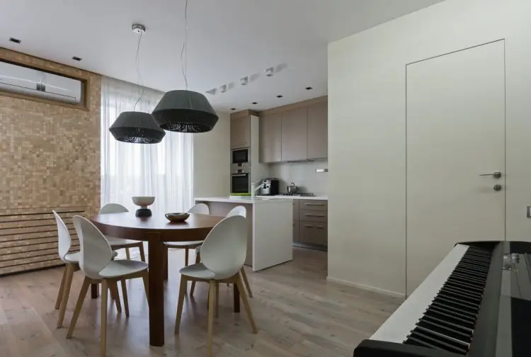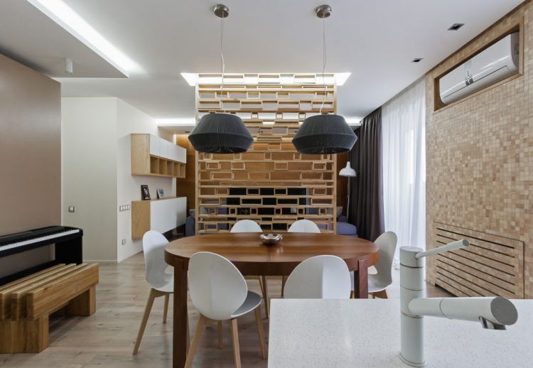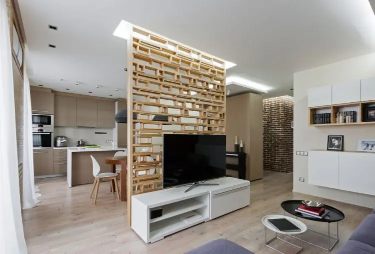 Pentru a compensa mobilarea minimala, designerul a lucrat la partea de volumetrii si texturi oferind dinamica amenajarii. Astfel, a optat pentru placari din pal pentru peretele din spatele canapelei sau pe texturi de caramida in spatiul din hol. La fel de interesant este si panoul care separa zona de living, de cea a bucatariei; delimitarea este discreta, rolul sau fiind unul pur decorativ.