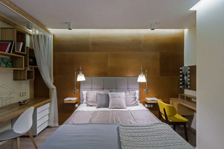 Dormitorul preia linia designului descris in camera de zi, placarea peretelui ca zona de accent fiind intalnita si aici. In dreptul ferestrei, a fost amenajat spatiul de lucru dorit de cei doi sub forma unui blat lung. De cealalta parte a camerei, a putut fi integrata si o zona de make-up.