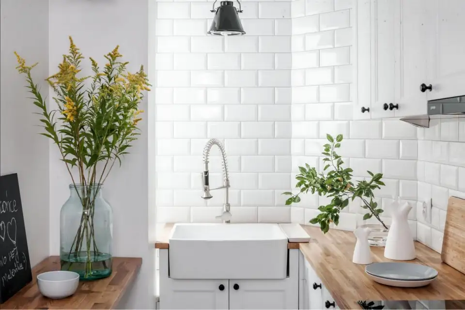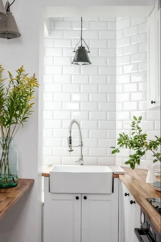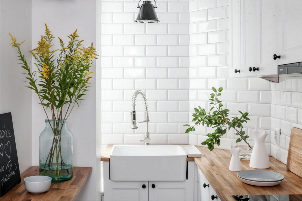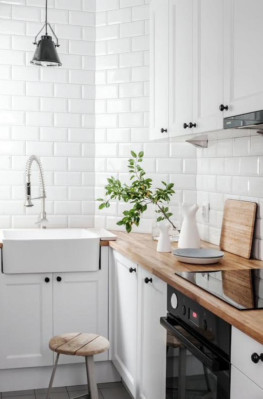 Spatiul destinat chiuvetei are un loc privilegiat, aflandu-se langa o sursa de lumina naturala – cel mai placut loc de spalat vasele! Placile de faianta tip Metro merg pana sus, spre tavan, iar frontul alb al dulapurilor fac spatiul sa para mai mare si, in special, mai luminos. Masuta rabatabila, alaturi de scaune ofera un mic loc pentru gustari rapide.