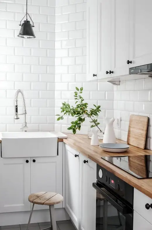 Bucataria pastreaza influente scandinave, accentul fiind pe functionalitate si pe a folosi cat mai bine spatiul disponibil. Alb predominant cu lemn la nivelul blatului de lucru si mobilier configurat in forma literei L.