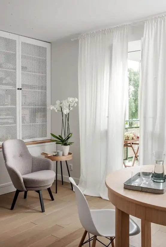 Zona de zi cuprinde un living mic si bucataria care a fost deschisa spre camera. Astfel, spatiile par conectate printr-o distributie coerenta. Fiecare piesa isi are rolul bine definit. Canapeaua cu masuta de cafea, locul de luat masa si un scaun-fotoliu ce poate servi ca un spatiu pentru lectura. Decoratiunile imbogatesc decorul si il personalizeaza intr-un mod original.