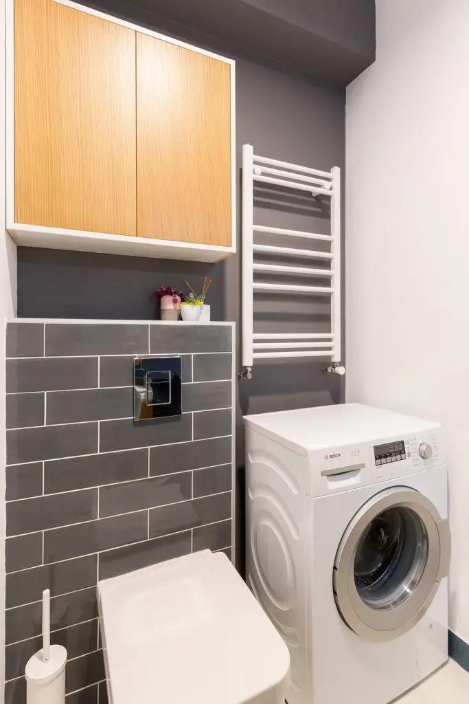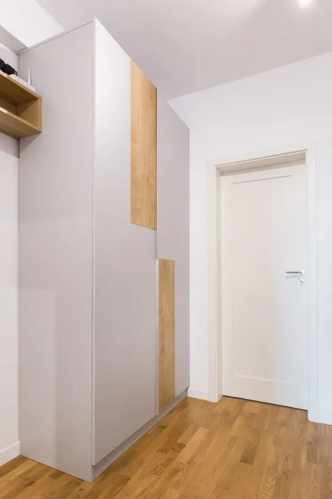 Functionalitatea se face remarcata si in cazul holului, spatiul de legatura intre camere, unde s-a optat pentru un dressing si un cuier asortat, in componenta caruia se regaseste si un pantofar.