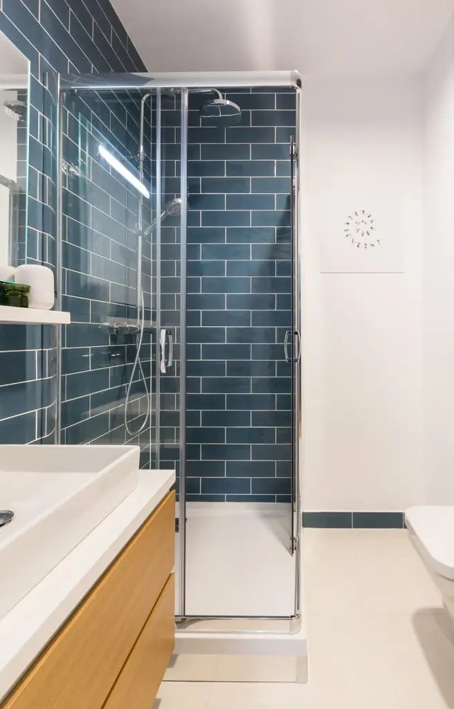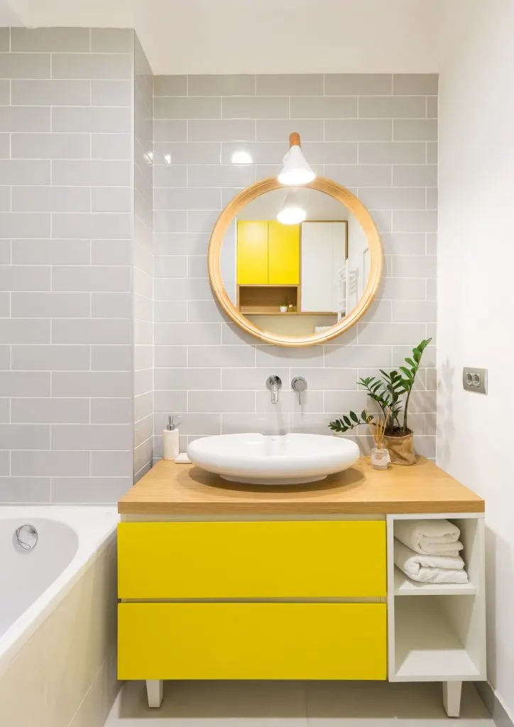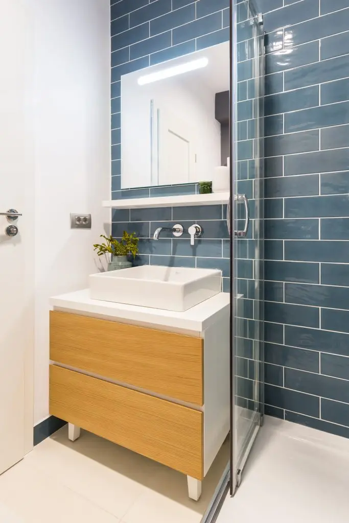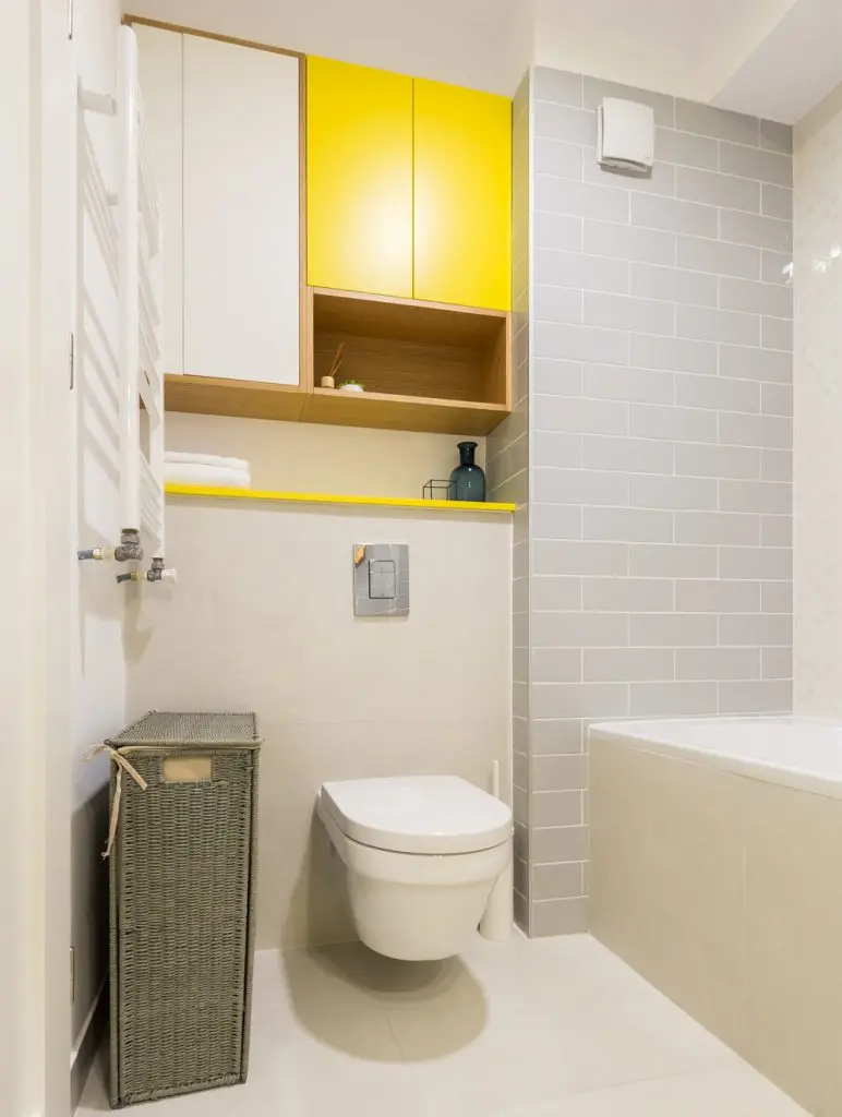 Aspectul geometric al celor doua bai se impune prin placile de faianta in placare rtesuta, asemanatoare texturii peretilor din caramida. Sticla si lemnul natural sunt cele doua componente de baza, impreuna cu oglinzile si lumina artificiala, marind vizual cele doua incaperi. Albastrul, galbenul si planetele decorative, traseaza intr-un mod cat mai evident liniile stilului scandinav, iar alaturi de obiectele sanitare sanitare, transforma cele doua bai, in spatii ultra moderne.