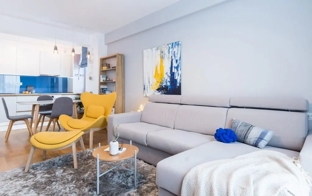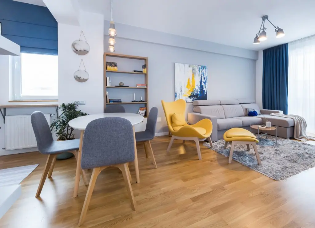 Zona de relaxare, cea de dining si bucataria, formeaza impreuna un open space luminos si cu accente naturale. Mobilierul este unul minimalist si modern, cu detalii atent gandite, iar accentele de culoare si materialele textile se imbina artistic cu lemnul si cantitatea impresionanta de lumina naturala. Albul imaculat al mobilierului bucatariei si culorile vibrante ale albastrului si galbenului scandinav, fac ca zona de pregatire a mesei sa vina armonios in continuarea living-ului, formand impreuna cu celelalte detalii cromatice un tablou perfect simetric.