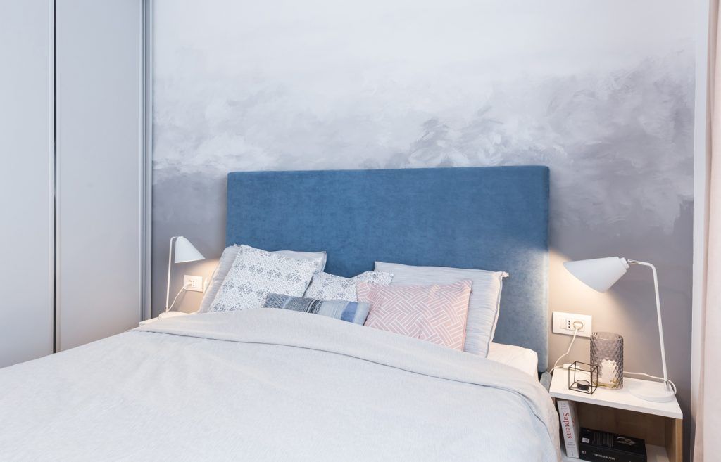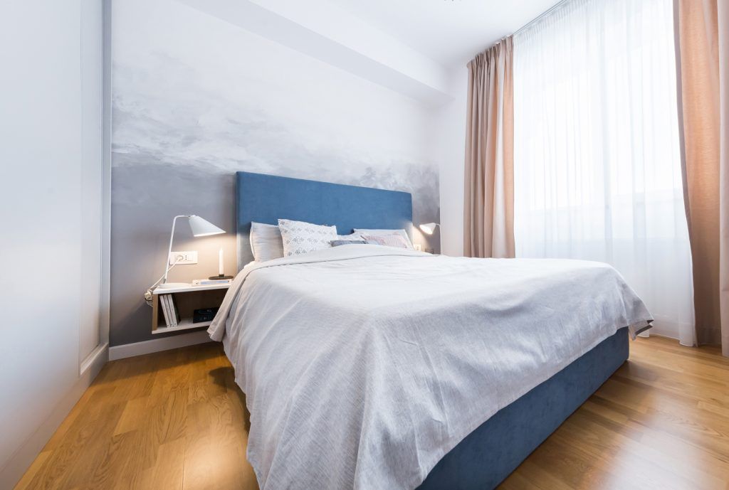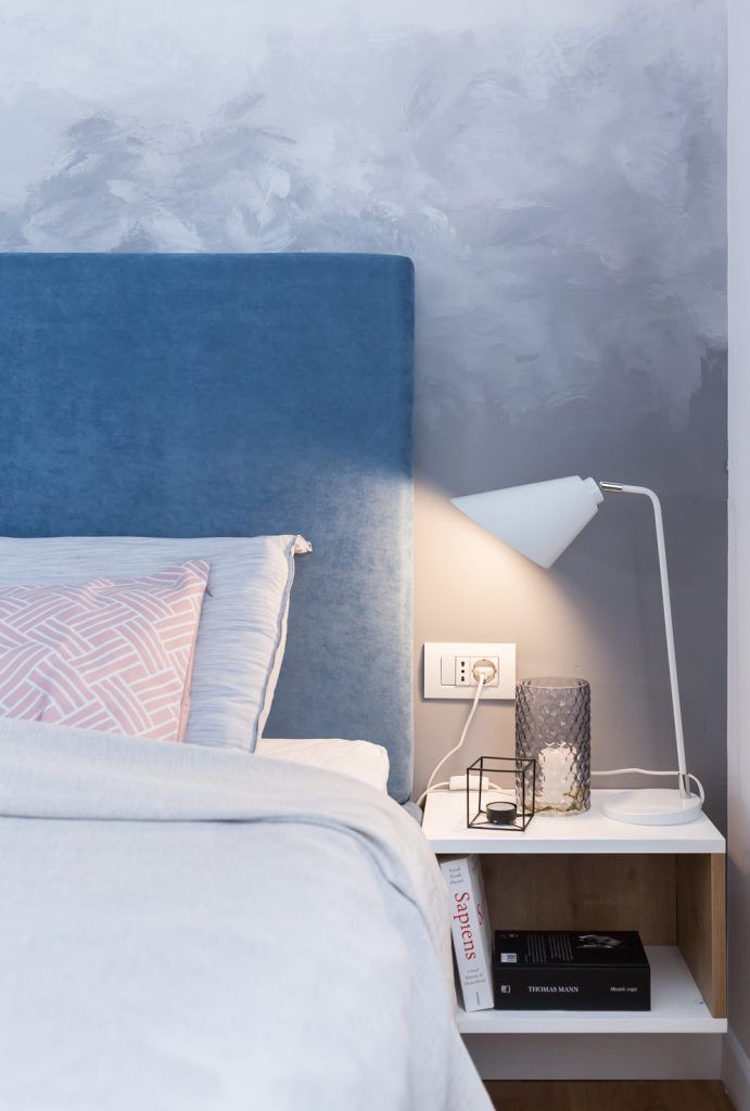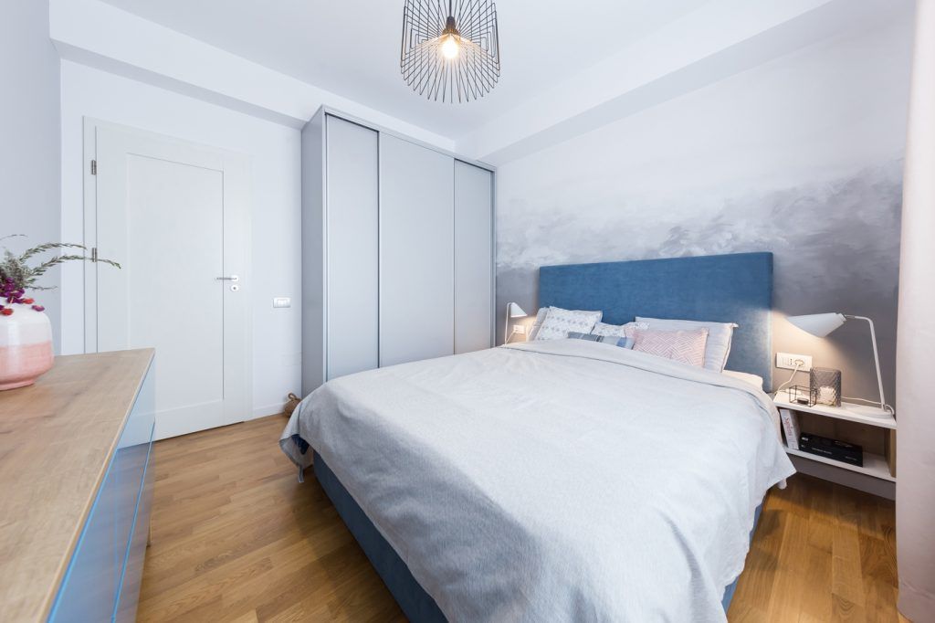 Acceasi simetrie se continua si in cazul dormitorului matrimonial care se prezinta artistic prin intermediul peretelui pictat manual, cromatica de baza fiind compusa din derivate de gri si accente de albastru. Pentru ca in cazul acestei camere relaxarea trebuie sa atinga cotele maxime, ideea de cer, nori si calatorie, capata cel mai important rol in obtinerea unui cadru perfect, delicat si simplist. Stilul liniar si minimalist al mobilierului compus dintr-un pat dublu, doua noptiere, comoda si dressing, se completeaza cu o harta stilizata din bond ce ilustreaza ideea de calatorie si cunoastere intr-un mod abstract.