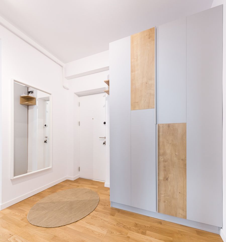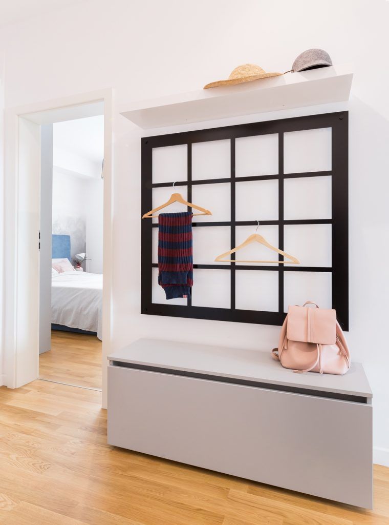 Functionalitatea se face remarcata si in cazul holului, spatiul de legatura intre camere, unde s-a optat pentru un dressing si un cuier asortat, in componenta caruia se regaseste si un pantofar.