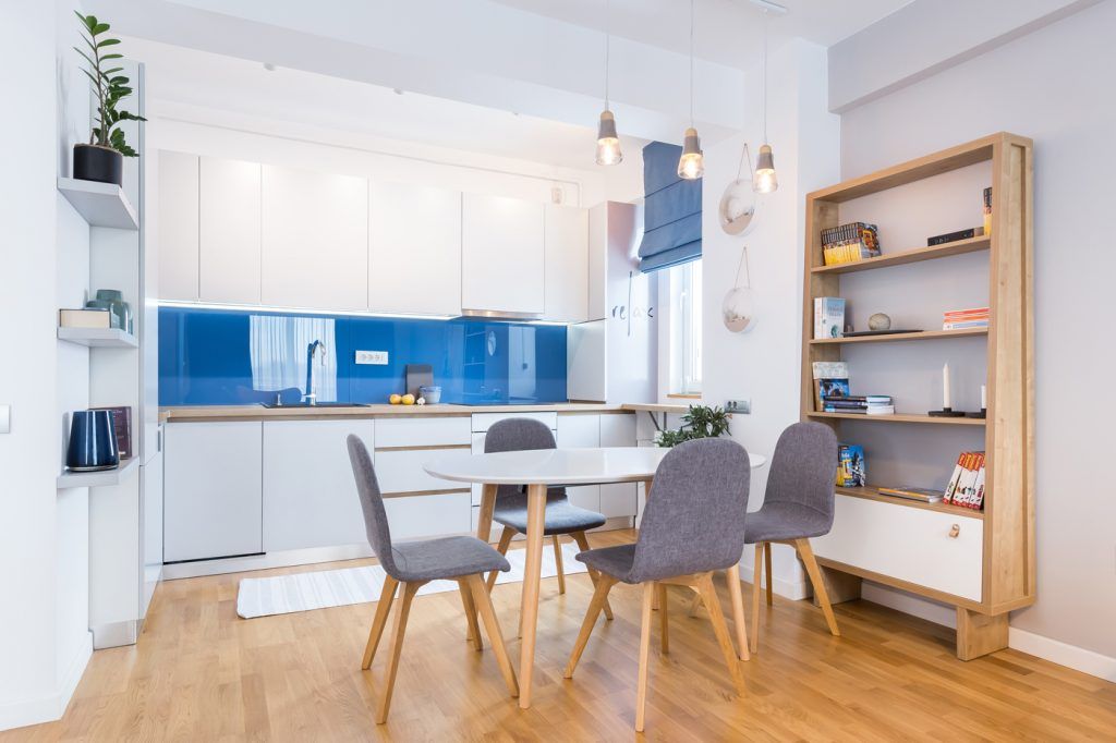 Zona de relaxare, cea de dining si bucataria, formeaza impreuna un open space luminos si cu accente naturale. Mobilierul este unul minimalist si modern, cu detalii atent gandite, iar accentele de culoare si materialele textile se imbina artistic cu lemnul si cantitatea impresionanta de lumina naturala. Albul imaculat al mobilierului bucatariei si culorile vibrante ale albastrului si galbenului scandinav, fac ca zona de pregatire a mesei sa vina armonios in continuarea living-ului, formand impreuna cu celelalte detalii cromatice un tablou perfect simetric.