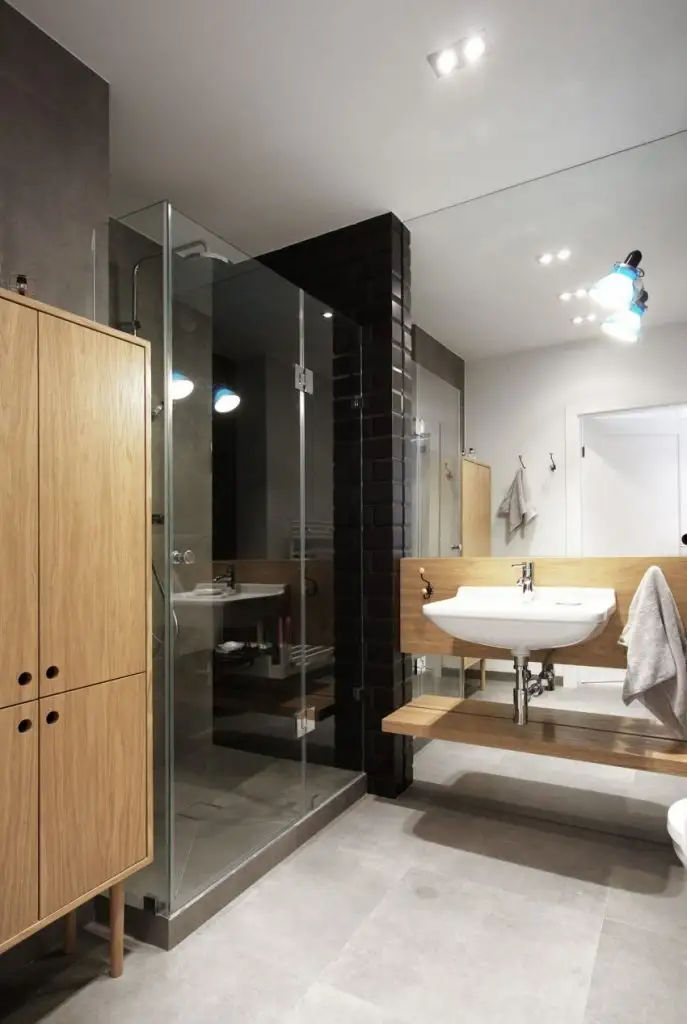 Arhitectii nu s-au ferit de a aduce accente dramatice in decor. Intr-una din cele 2 bai, vom gasi un perete cu faianta neagra, si restul acoperit cu flise gri ce imita aspectul de piatra naturala destinata partii masculine a familiei. In cea de-a doua baie, albul este predominant, cabina de dus din prima baie fiind inlocuita aici cu o cada moderna.