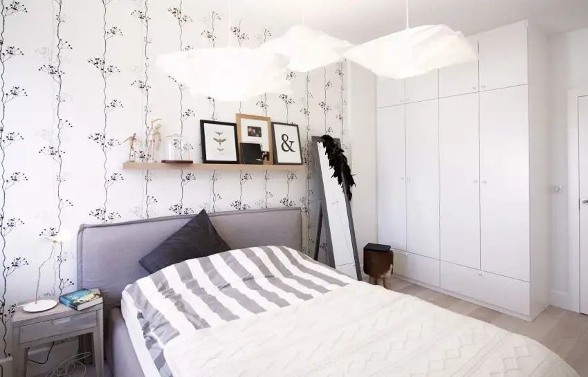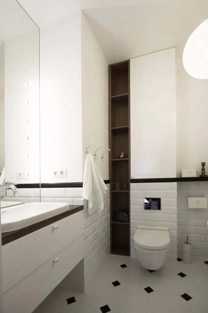 Cele 3 etajere albe preiau o parte din depozitarea din dulapuri si nu agreseaza vizual spatiul.