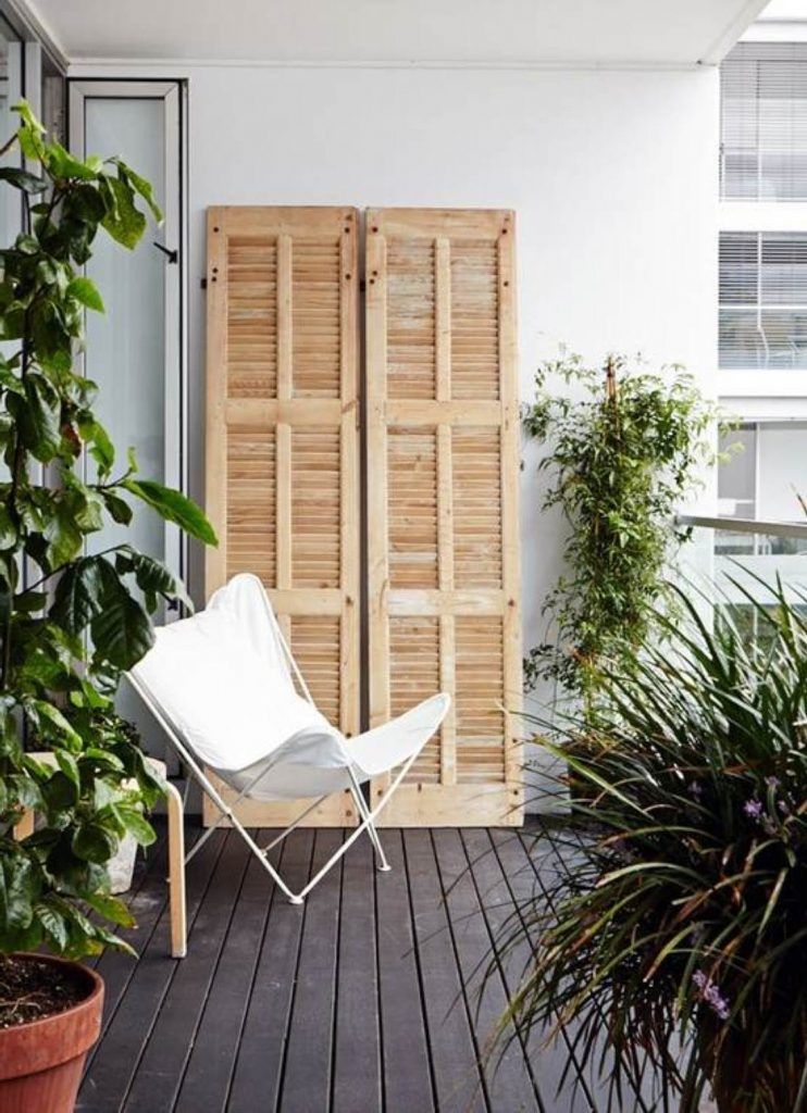 Terasa de bloc devenita gradina urbana, prin inserarea unor elemente de mobilier simple si naturale.