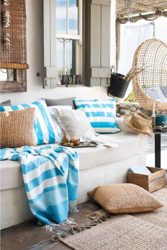 In aceasta compozitie, husele de perne din paie de hartie impletite se completeaza cu cele in dungi marinaresti.