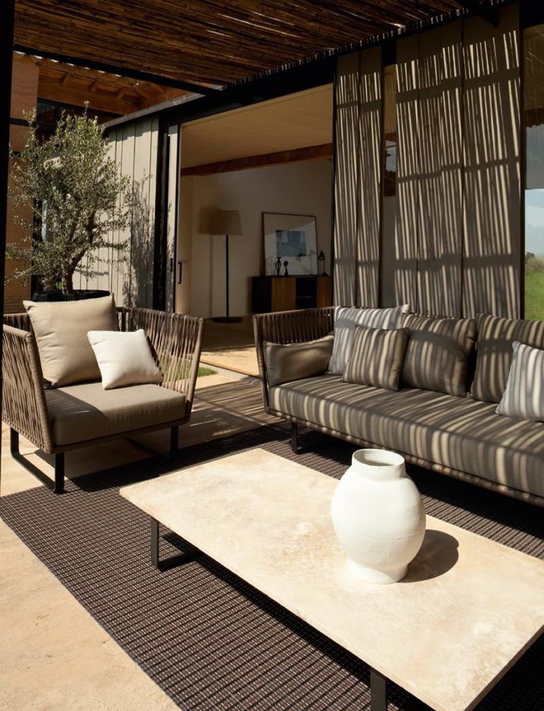 Mobilier de exterior in culori pamantii. Spatarul perforat al scaunelor si al canapelei contrasteaza cu masivitatea pieselor.