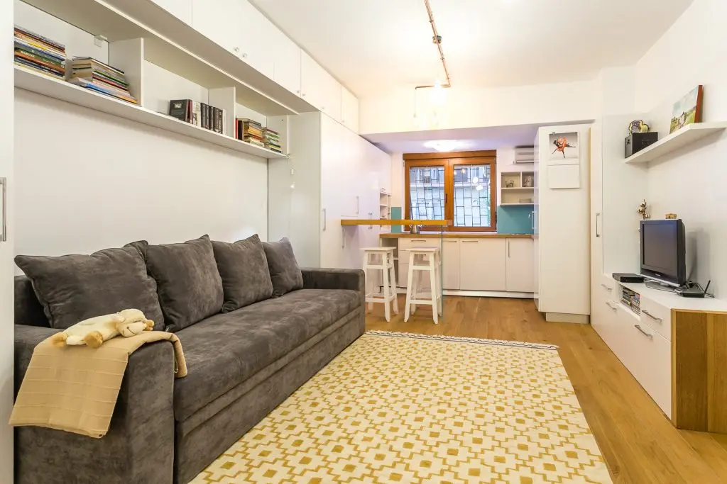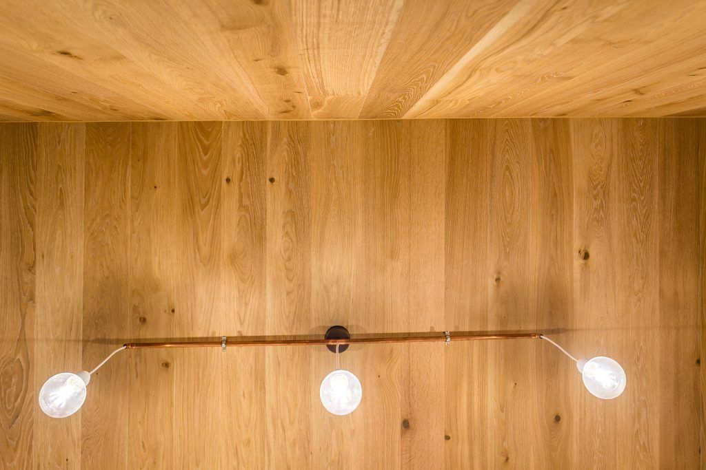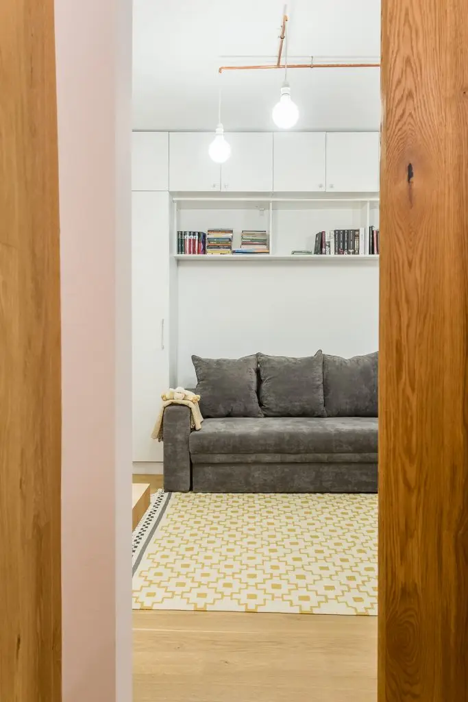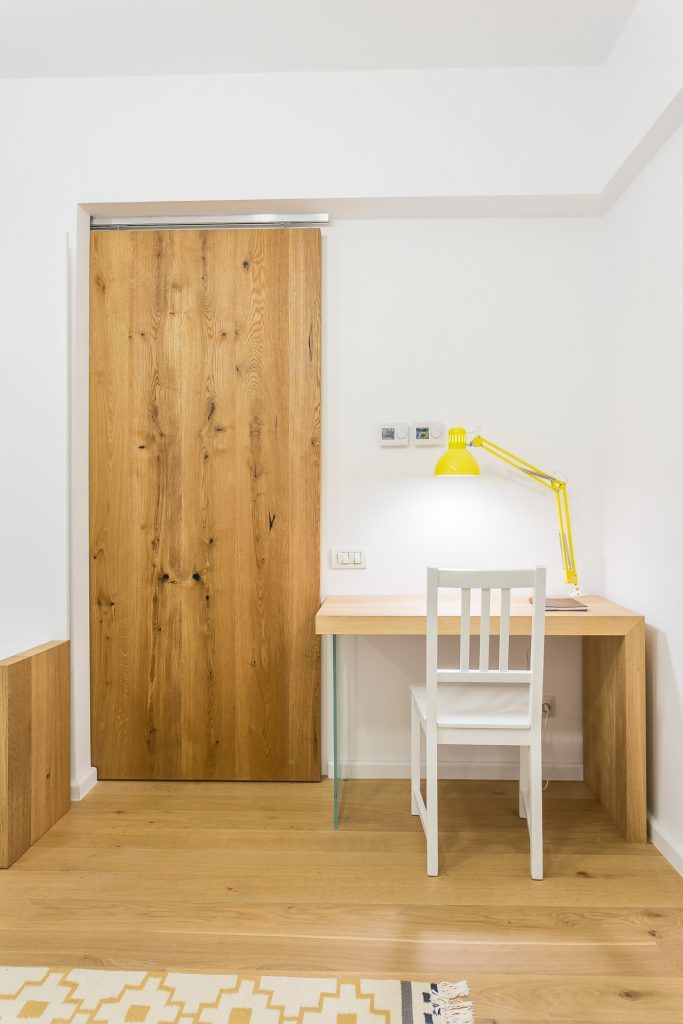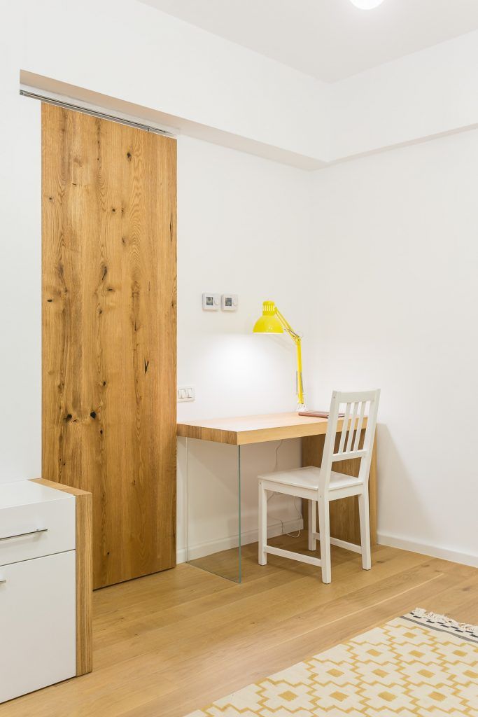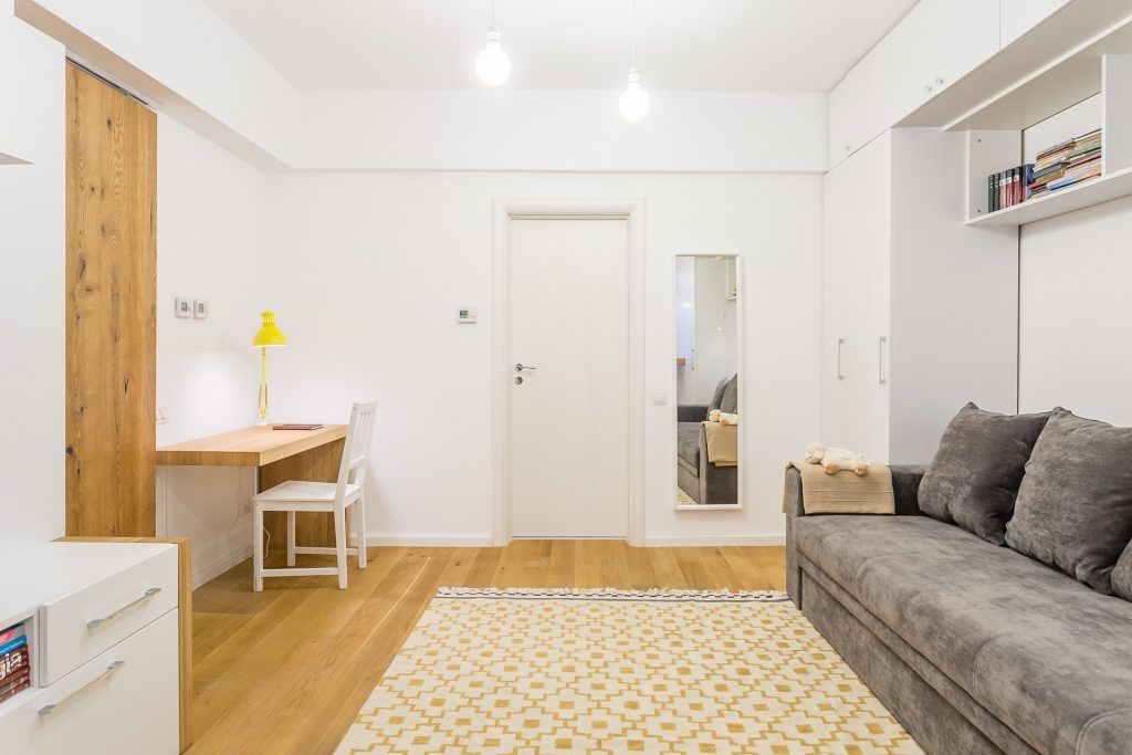 Camera inglobeaza 3 functiuni importante: zona de canapea si de dormit, zona de bucatarie si cea de birou. Dorind sa creeze o unitate a spatiului a optat pentru aceeasi textura de lemn peste tot, de la pardoseala, la blatul de bucatarie, bar, biblioteca, birou si chiar usa glisanta. Echipa de la Parchet pe viata s-a ocupat de toata manopera.