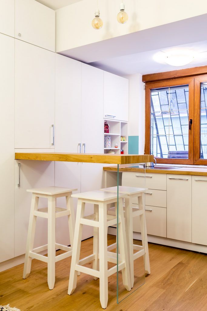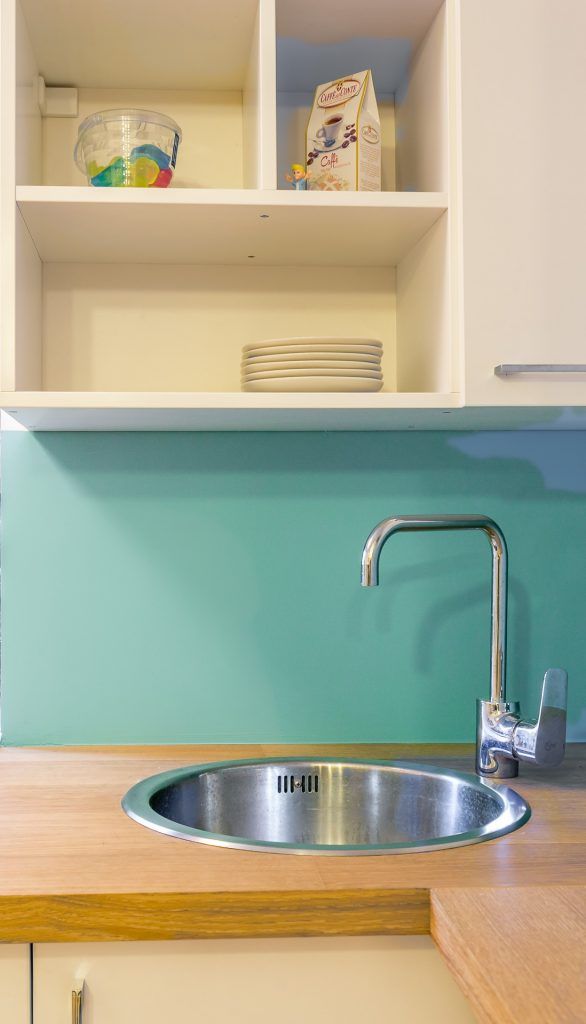 In zona de bucatarie, amenajarea urmeaza aceeasi linie minimalista, compacta, cu toate electrocasnice incorporate pentru a pastra totul ordonat si unitar. Ca accent intre corpurile de mobilier, a fost ales turcoazul, una din culorile preferate ale beneficiarei; zona a fost zugravita cu lavabil potrivit zonelor umede de la Ton Corner.
