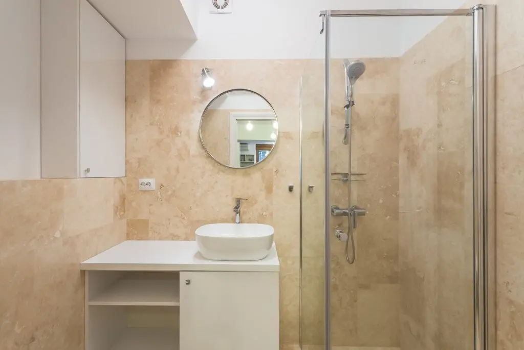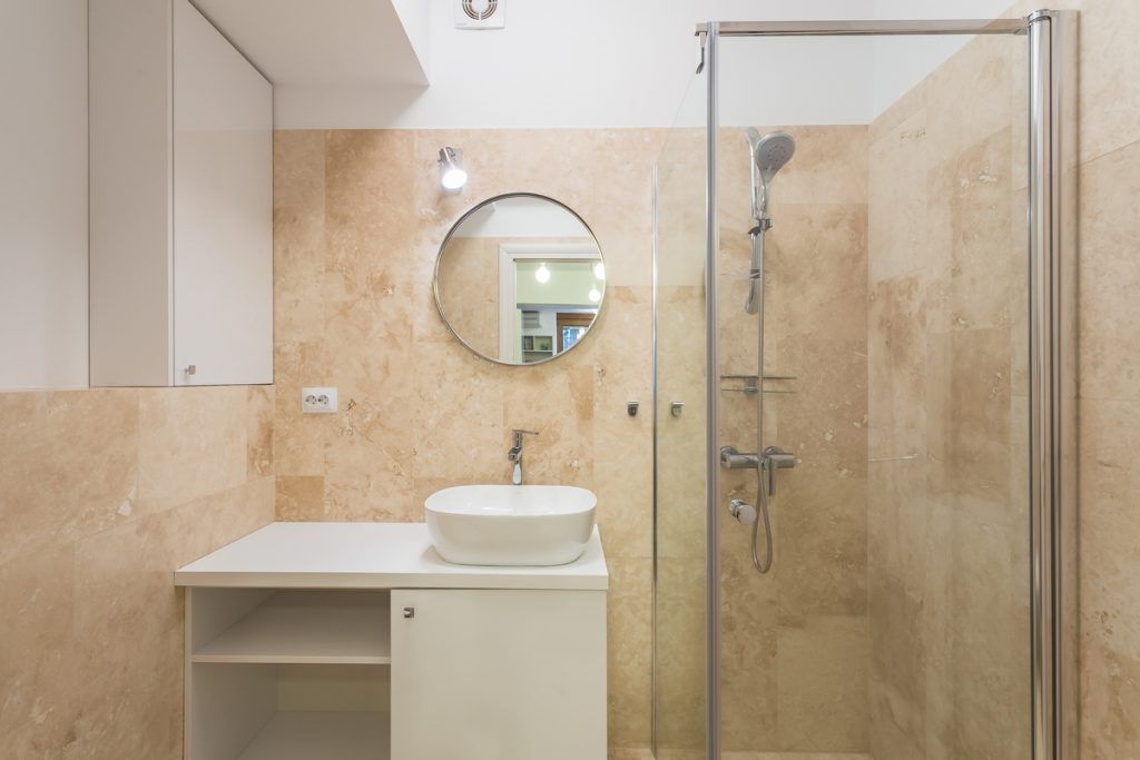 Pentru spatiul mic din baie, s-a continuat ideea finisajelor naturale prin placare cu travertin, mobilierul fiind alb. Incalzirea este electrica in pardoseala pentru toata garsoniera.