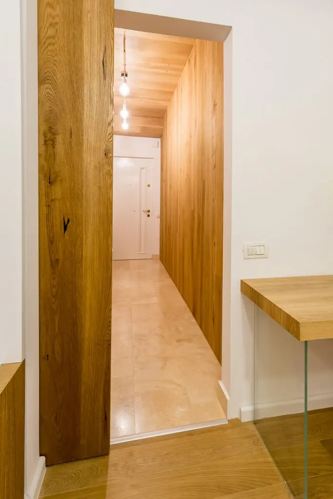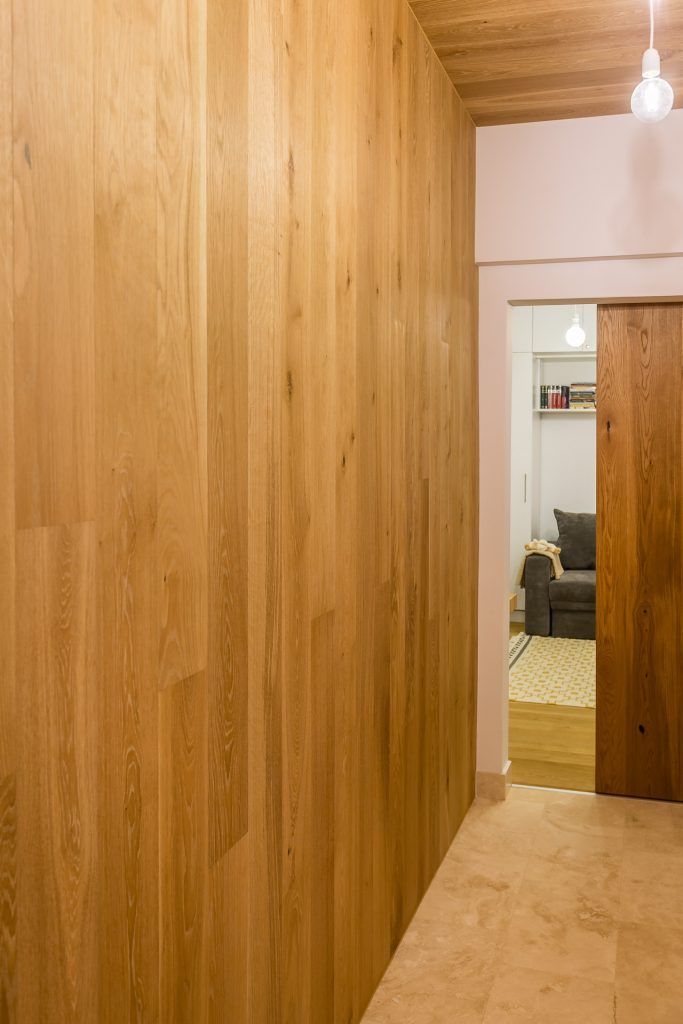 Spatiul este format dintr-un hol lung si ingust, camera principala cu foarte putina lumina naturala si o baie mica. De aceea, Hajni a optat pentru un spatiu cat mai minimalist amenajat, cu finisaje naturale si mobilier alb. Pentru a oferi un hol calduros si atipic a imbracat un perete si tavanul in parchet triplustrat, iar pentru pardoseala a ales travertinul.