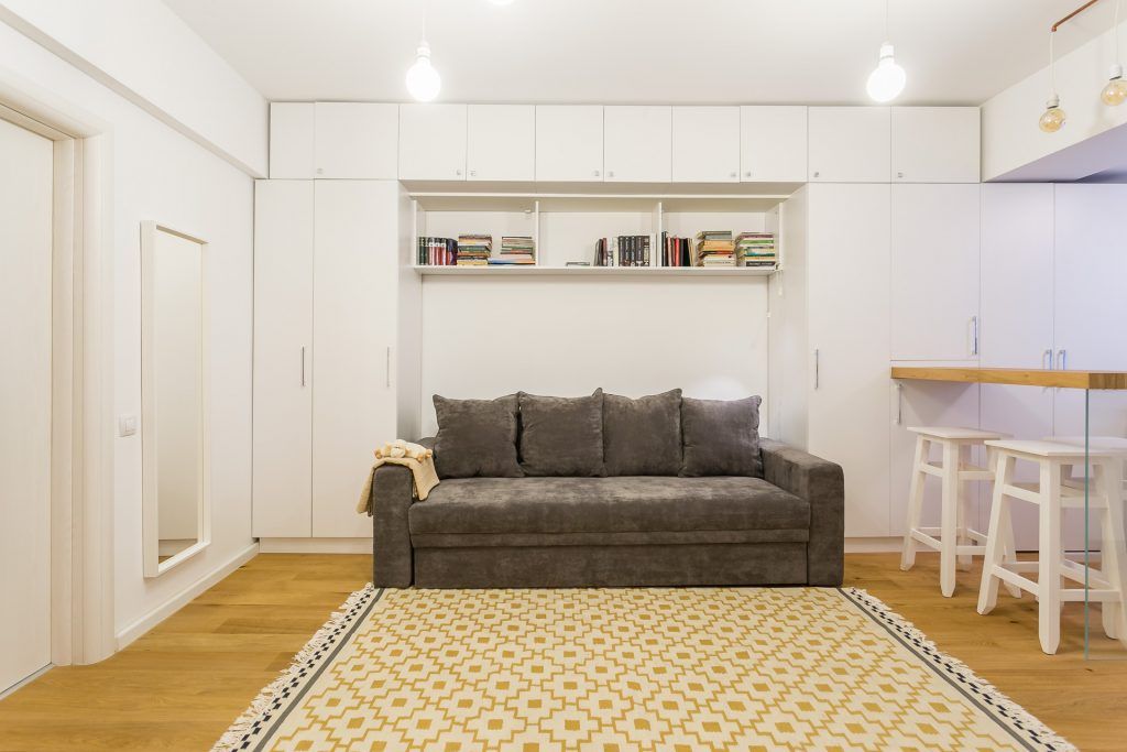 Zonele de depozitare au fost dispuse simetric, de o parte si cealalta a canapelei, piesa centrala a camerei; a fost realizata pe comanda la Canapele Eco si este extensibila pentru a se transforma in zona de dormit.