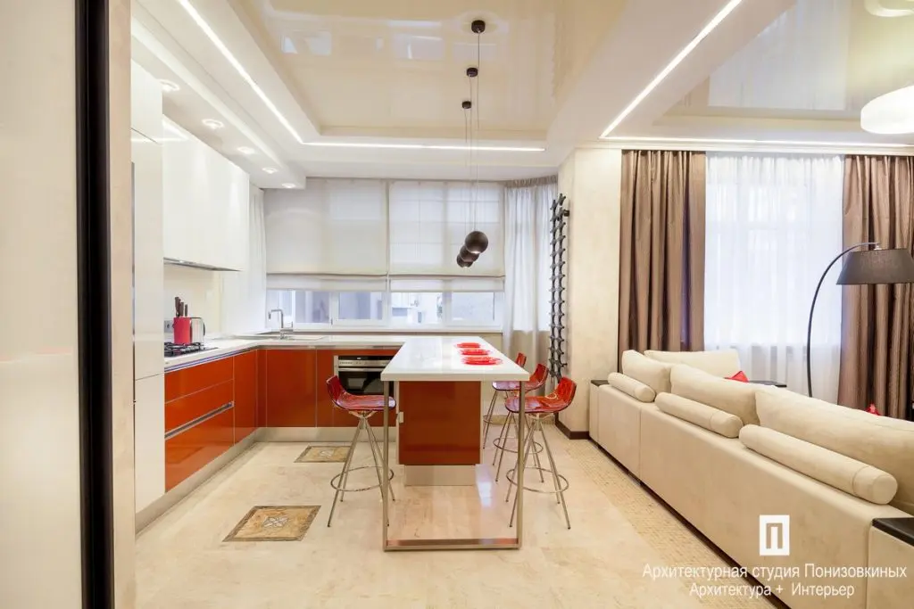 Bucataria primeste o infuzie de culoare prin rosul energic al dulapurilor inferioare si al scaunelor de bar. Aspectul lucios al mobilierului reflecta lumina si creeaza senzatia de spatialitate.