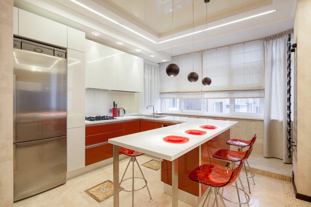 Bucataria primeste o infuzie de culoare prin rosul energic al dulapurilor inferioare si al scaunelor de bar. Aspectul lucios al mobilierului reflecta lumina si creeaza senzatia de spatialitate.