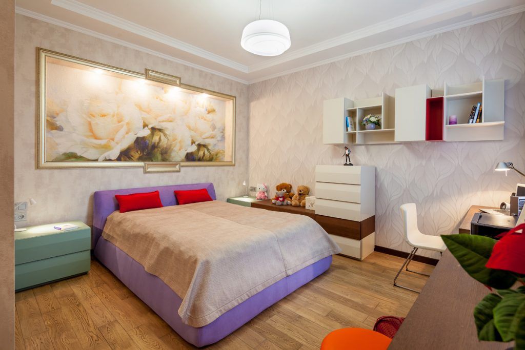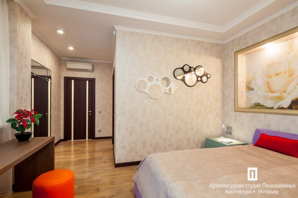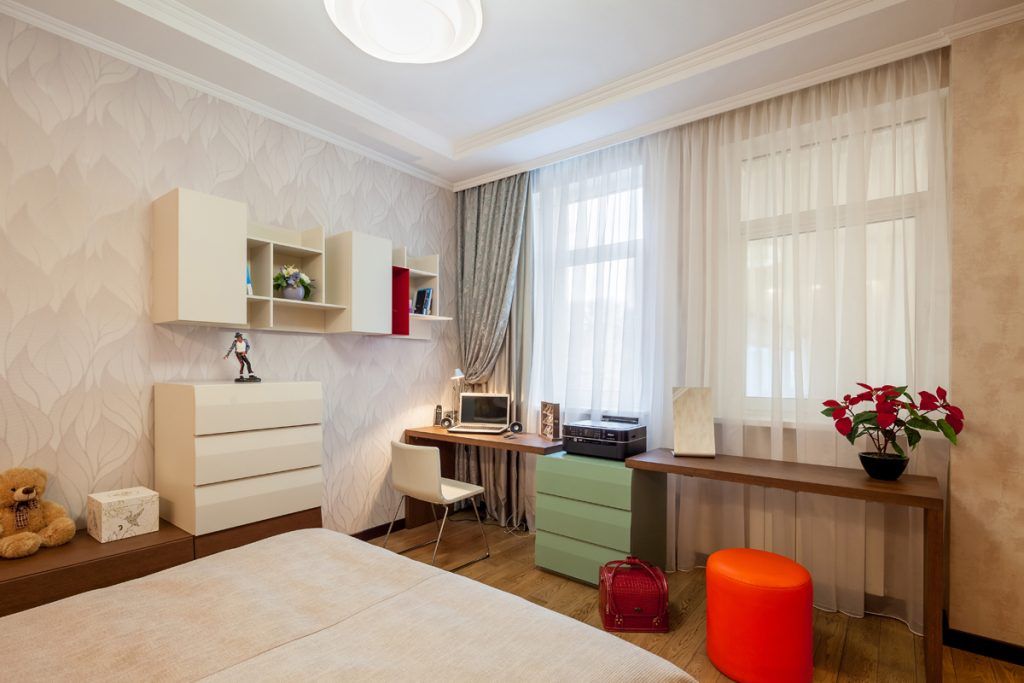 Dormitorul este suficient de spatios, in zona ferestrelor amplasandu-se chiar doua zone de birou, care pot deveni la nevoie spatii eficiente de lucru. Culorile vesele sunt potolite de nuantele neutre, obtinandu-se astfel un decor echilibrat.