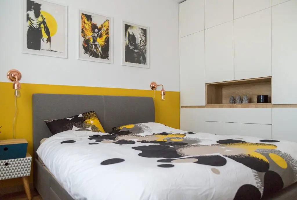 Aceeasi linie de amenajare o intalnim si in dormitor. Jumatate din peretele pe care este amplasat patul a fost vopsit in galben, oferind senzatia de alungire a camerei. Tablourile amplasate deasupra patului vin in completarea orizontalei galbene descriind punctul de interes al camerei.