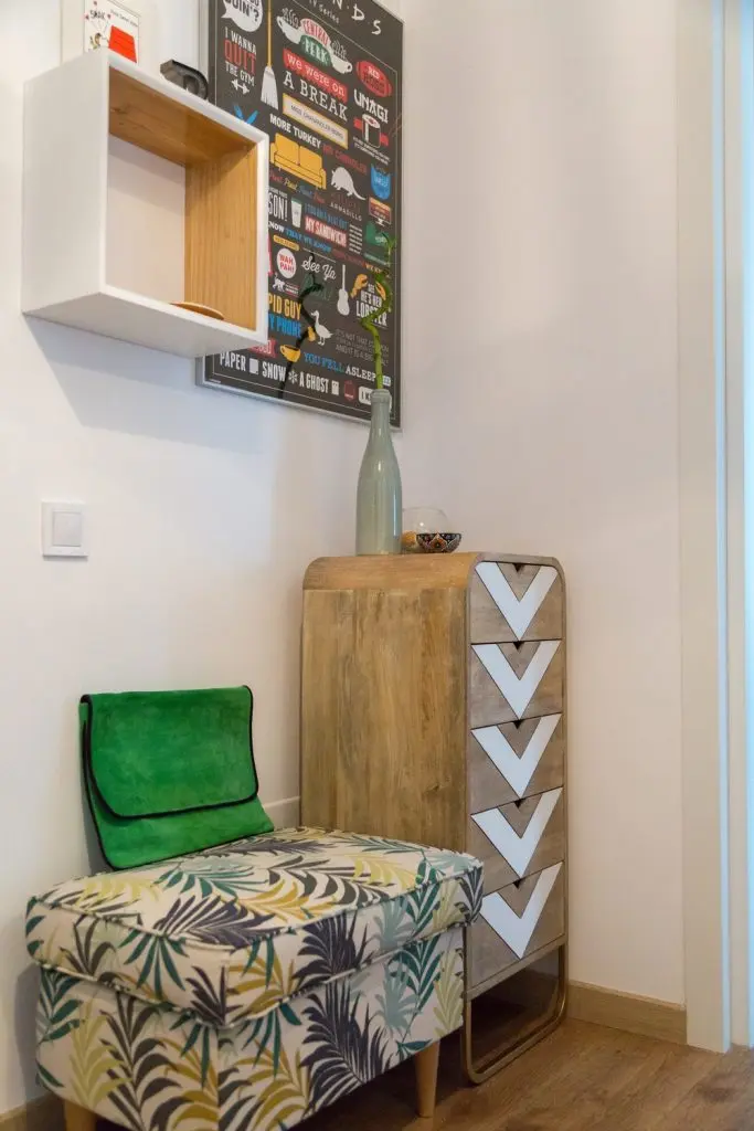 Holul inglobeaza un dulap discret amplasat, insa iese din anonimat prin piesele mici de mobilier si decoratiuni. Bancheta cu motive exotice ofera o pata de culoare zonei, iar comoda cu sertare se face remarcata prin finisajul de lemn patinat. Amenajarea astfel rezultata descrie o locuinta vesela, in care fiecare obiect si detaliu contribuie la transformarea spatiului intr-un veritabil acasa.