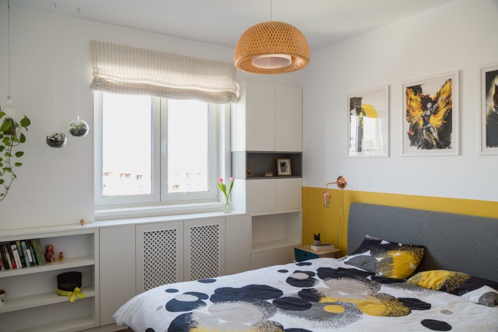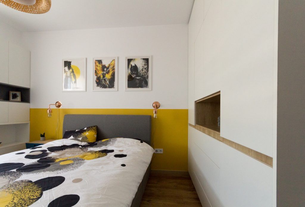 Aceeasi linie de amenajare o intalnim si in dormitor. Jumatate din peretele pe care este amplasat patul a fost vopsit in galben, oferind senzatia de alungire a camerei. Tablourile amplasate deasupra patului vin in completarea orizontalei galbene descriind punctul de interes al camerei.