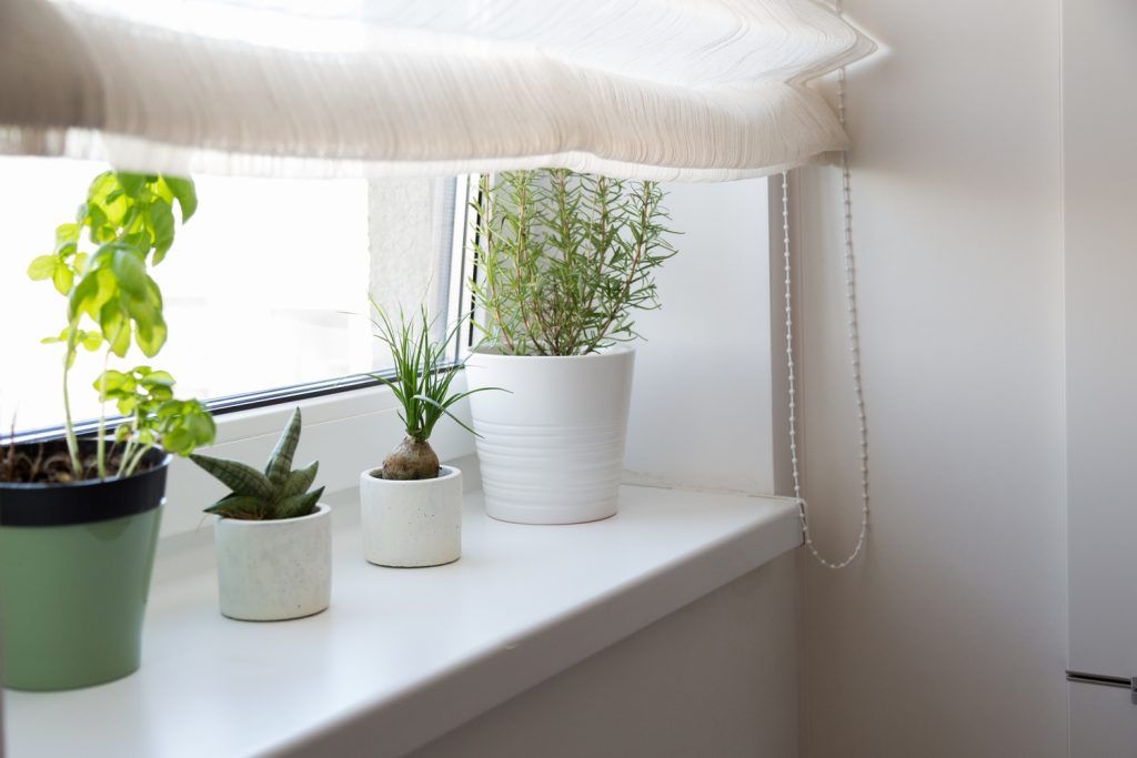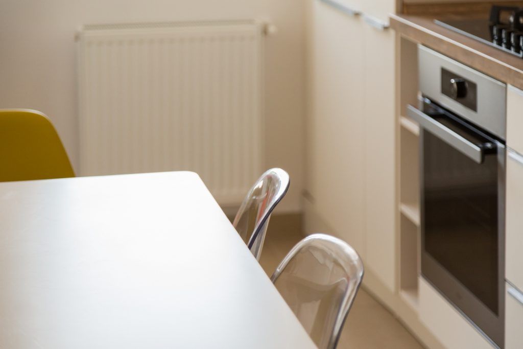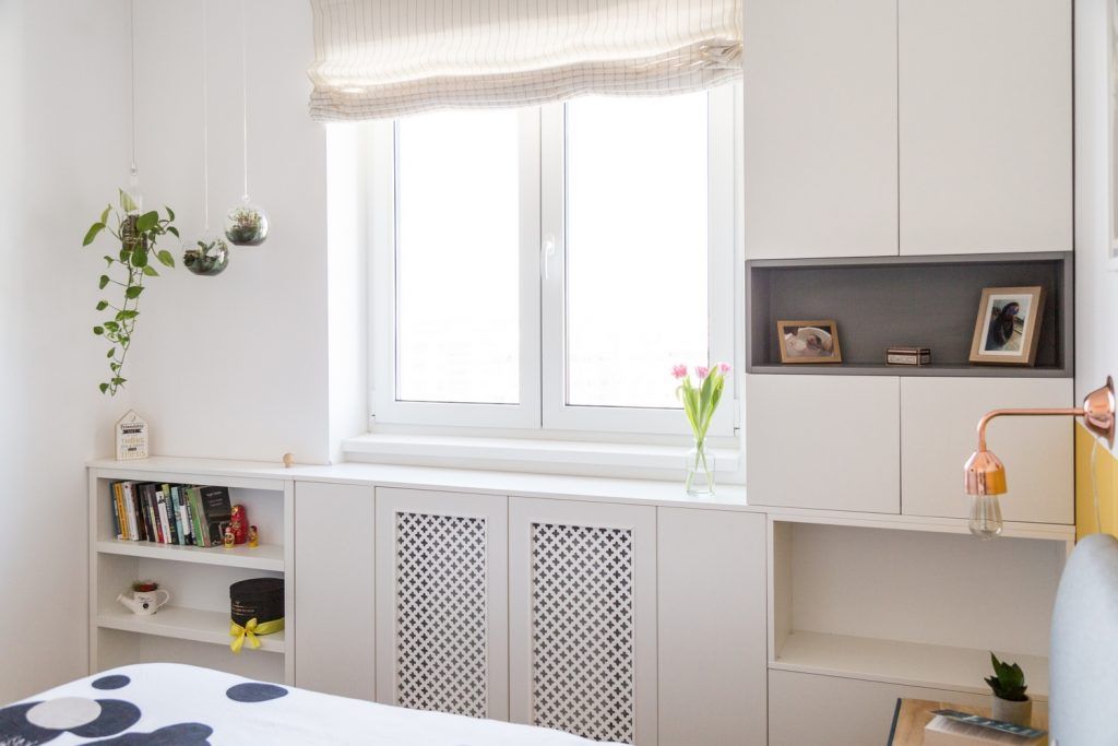 Spatiul din jurul ferestrei a fost excelent valorificat, mobilierul amplasat aici mascand caloriferul si oferind un plus pentru depozitare.