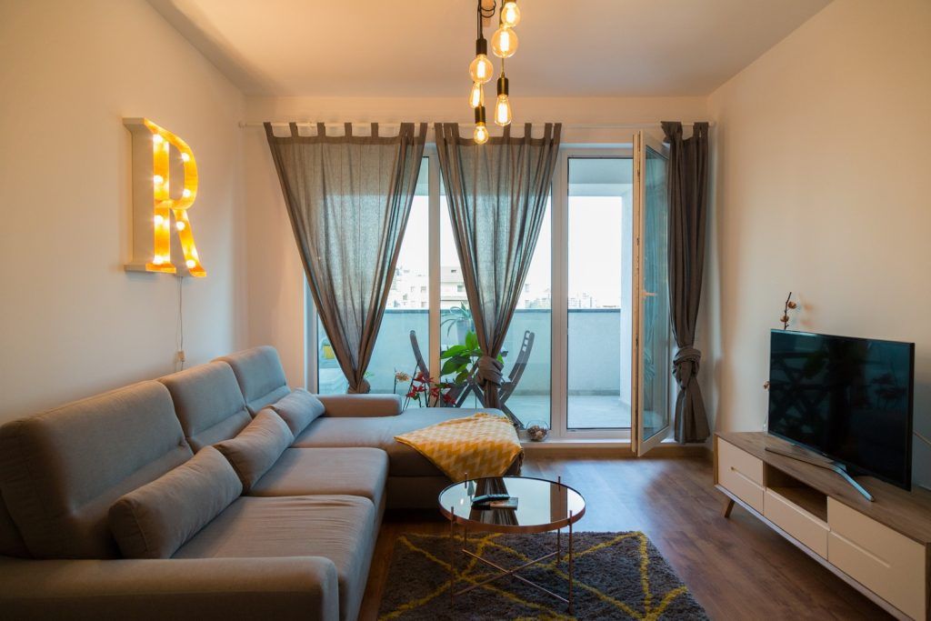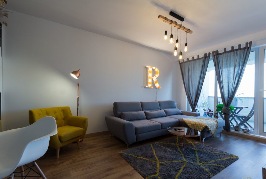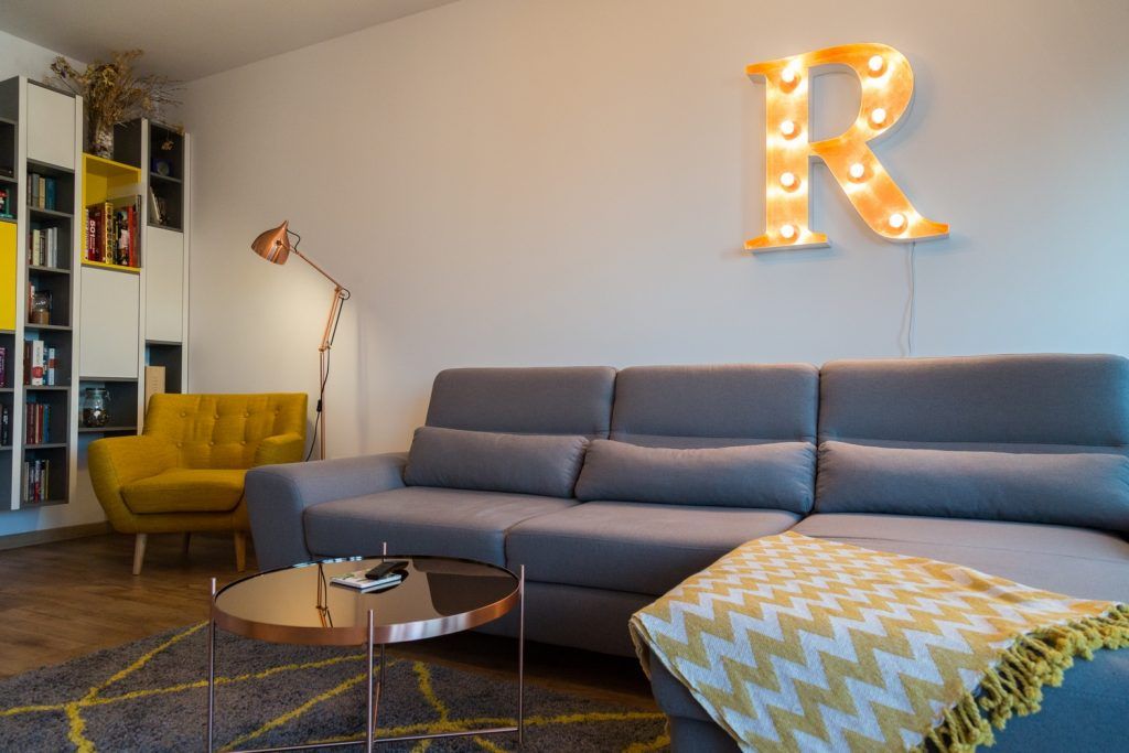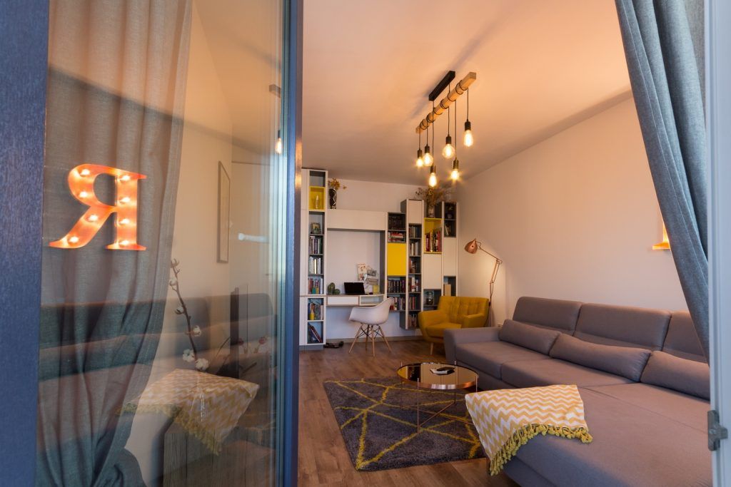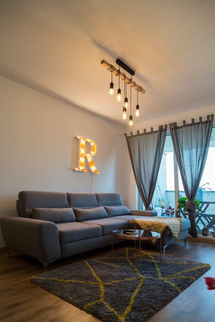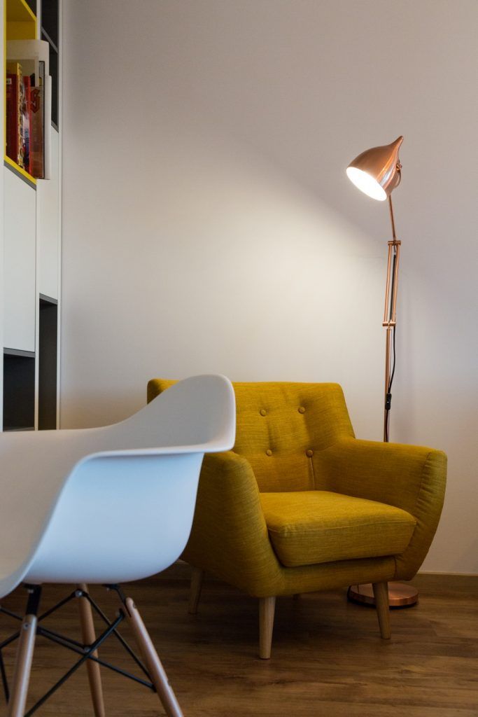 Fotoliul galben se face remarcat atat prin design cat si prin culoare, accentuat de lampadarul cu finisaj de cupru, creandu-se astfel un colt minunat pentru lectura. Lumina generala a camerei este oferita de corpul de iluminat cu un design aparte prin becurile Edison, iar litera luminoasa amplasata deasupra canapelei accentueaza influentele retro din decor.
