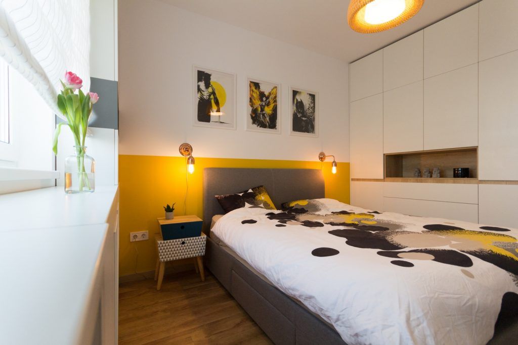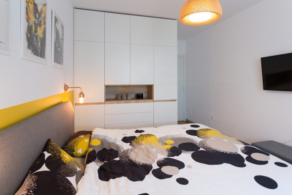 Desi dormitorul este redus ca dimensiune, s-a reusit integrarea unui dulap pentru depozitare, iar solutia de mobilare este una echilibrata atat la nivel compozitional, cat si cromatic. Albul este predominant, fiind accentuat de gri, galben si textura de lemn pe alocuri.