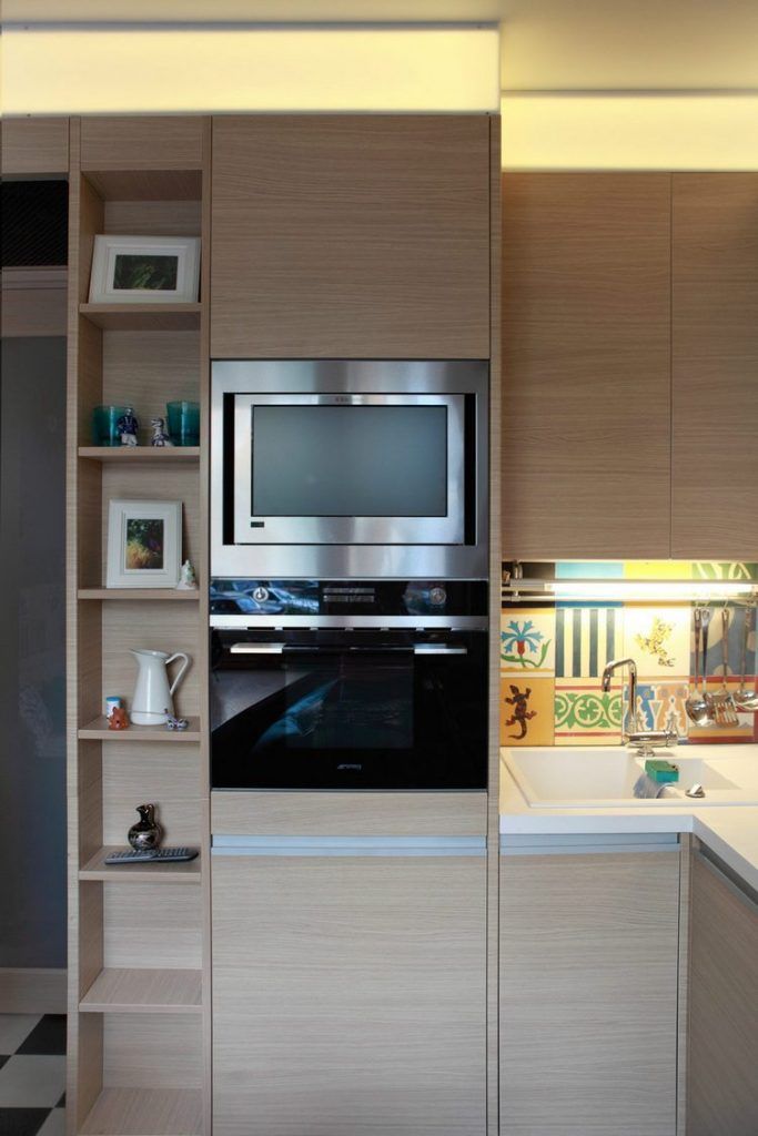 Deschide Galeria In realizarea acestui proiect designerula mizat pe crearea de zone functionale, cu electrocasnicele incastrate pentru a pastra un concept unitar si ordonat. A ales un furnir din lemn natur pentru a pastra o baza neutra si apoi a venit cu accentele de culoare ale placilor decorative. Pentru a marca zona de luat masa, a creat un perete-accent cu albastru.