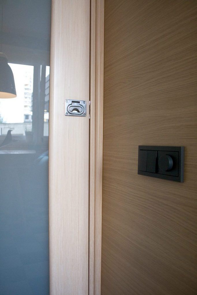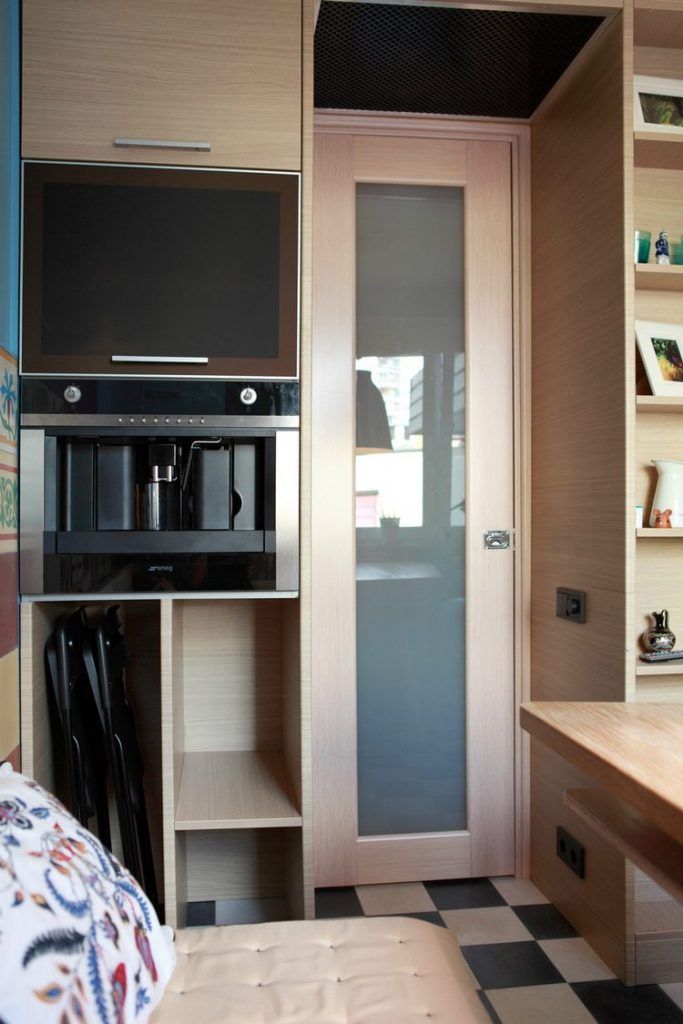 Pe langa spatiul tehnic ce cuprinde zonele de lucru specifice unei bucatarii, designerul a prevazut corpuri simetric dispuse de o parte si cealalta a usii. Dulapurile integrate aduc un plus destinat depozitarii. Avem astfel un loc pentru a aseza scaunele pliante, dar si un corp in care a fost incorporat un espressor (sau cuptor cu microunde, dupa caz). Corpul cu rafturi este un loc excelent pentru decoratiuni specifice sau carti.