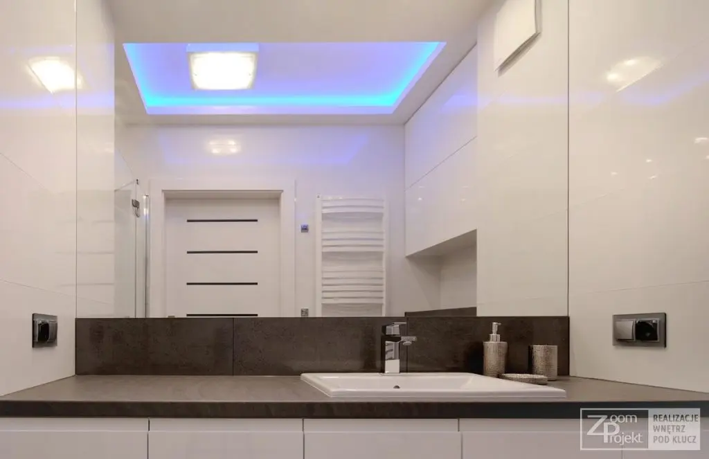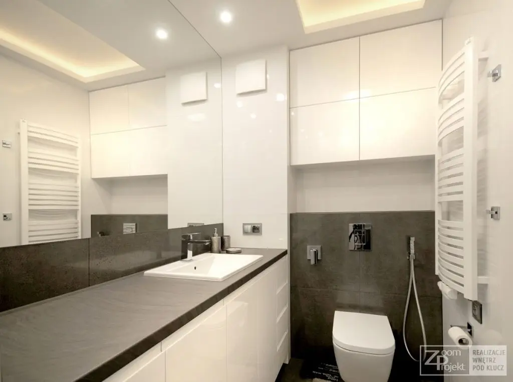 In spatiul baii regasim aceeasi abordare moderna, cu multe spatii de depozitare. Predomina mobilierul din M DF cu aspect lucios, combinat cu placi gri de granit. O astfel de amenajare te poate inspira daca te gandesti la un viitor spatiu modern, usor de decorat.