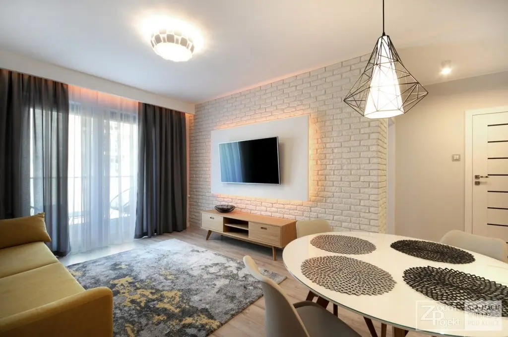 Un perete tapetat care imita caramida alba alaturi de perdele si un covor completeaza amenajarea intr-un mod placut.
