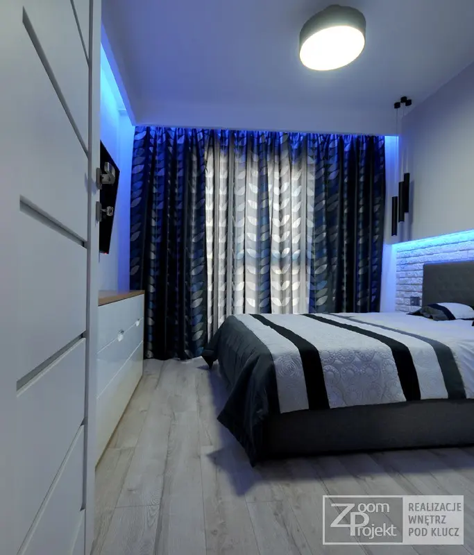 In dormitorul minimalist regasim o abundenta a spatiilor de depozitare, insa patul este piesa centrala a acestei incaperi. Remarcam prezenta aceluiasi tapet care imita un perete din caramizi albe, incadrat de benzi iluminate si corpuri suspendate care creeaza o zona de accent ce invita la relaxare.