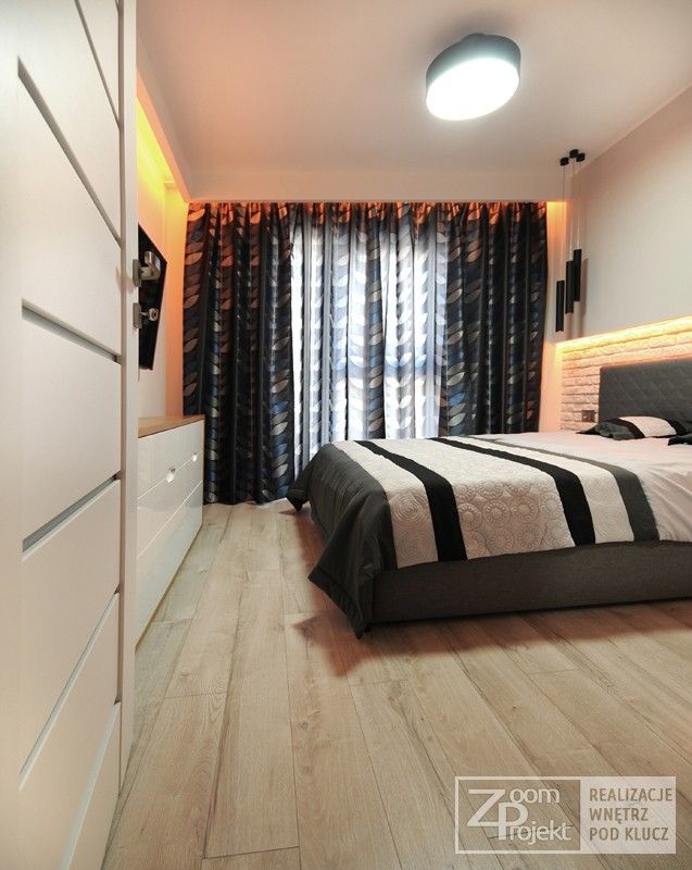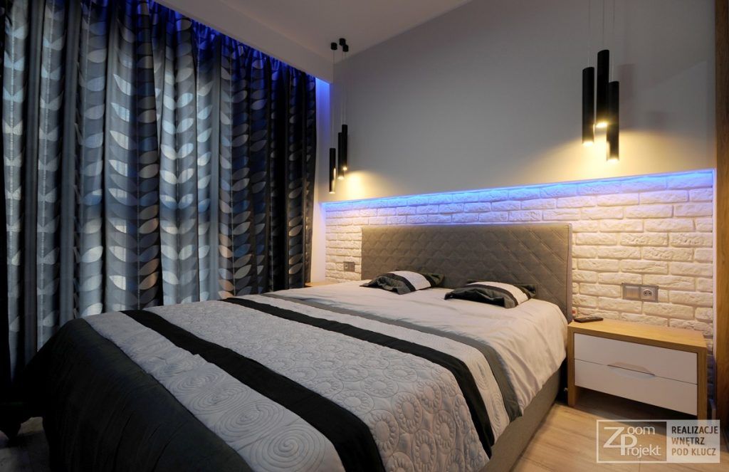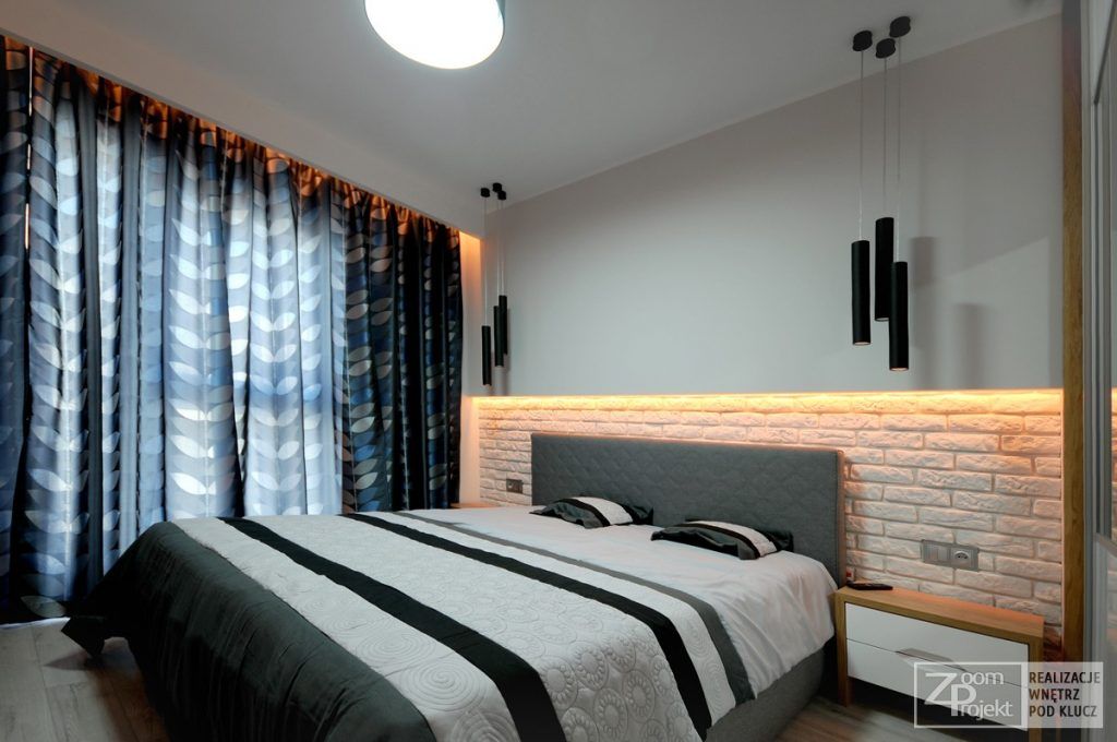 In dormitorul minimalist regasim o abundenta a spatiilor de depozitare, insa patul este piesa centrala a acestei incaperi. Remarcam prezenta aceluiasi tapet care imita un perete din caramizi albe, incadrat de benzi iluminate si corpuri suspendate care creeaza o zona de accent ce invita la relaxare.