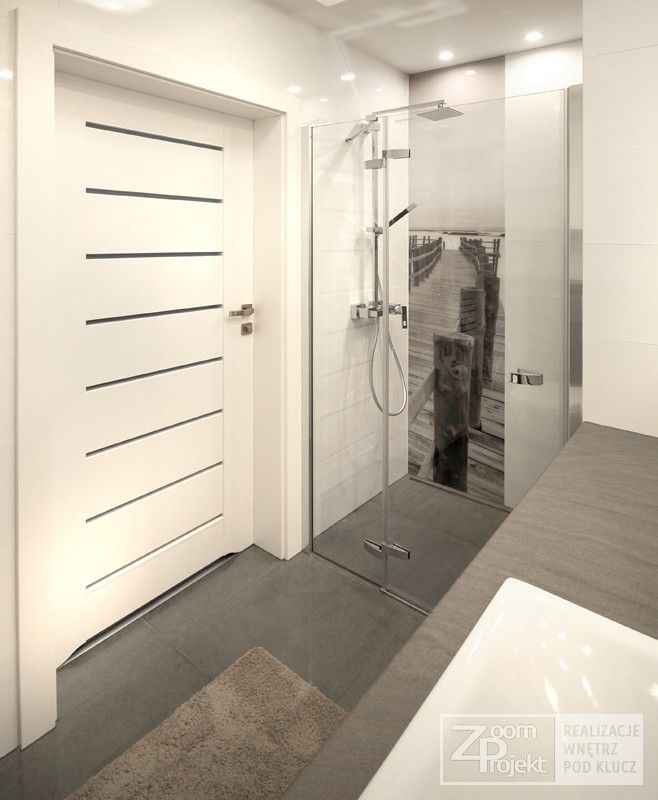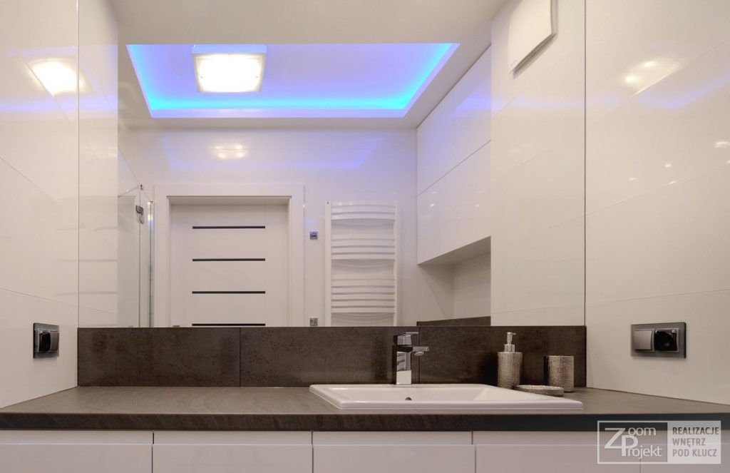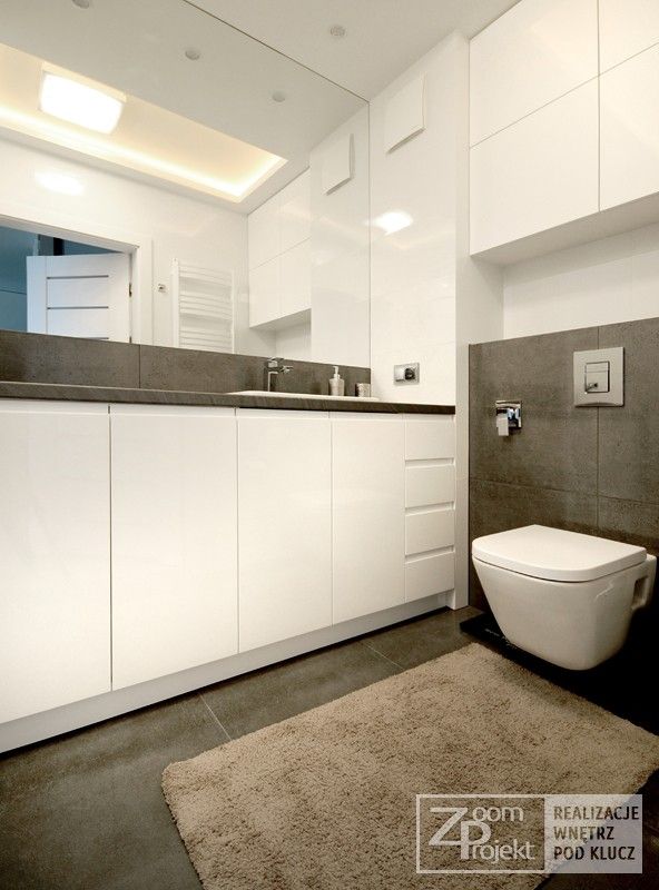 In spatiul baii regasim aceeasi abordare moderna, cu multe spatii de depozitare. Predomina mobilierul din M DF cu aspect lucios, combinat cu placi gri de granit. O astfel de amenajare te poate inspira daca te gandesti la un viitor spatiu modern, usor de decorat.
