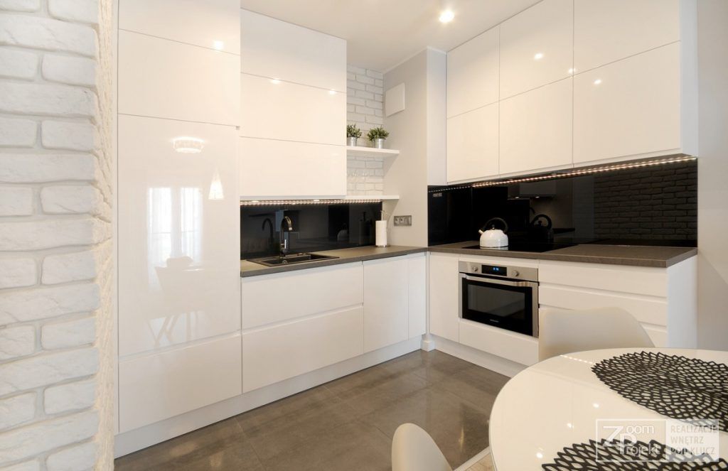 Bucataria este reprezentata in cel mai compact si functional mod posibil. Abundenta spatiilor de depozitare dispuse pe doua randuri pastreaza amenajarea ordonata si unitara. Mobilierul din M DF lucios reflecta lumina, sporind senzatia de spatialitate. Un detaliu interesant este corpul de iluminat cu forma geometrica care imprima intr-un mod discret un aspect industrial.