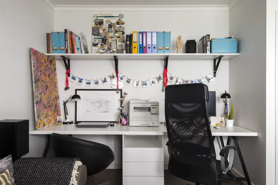 Spatiul din living este amenajat minimal, accentul fiind pe zona de lucru cu cele 2 birouri si depozitarea aferenta. Parchetul in tonuri inchise contrastreaza cu restul detaliilor, imprimand profunzime decorului.