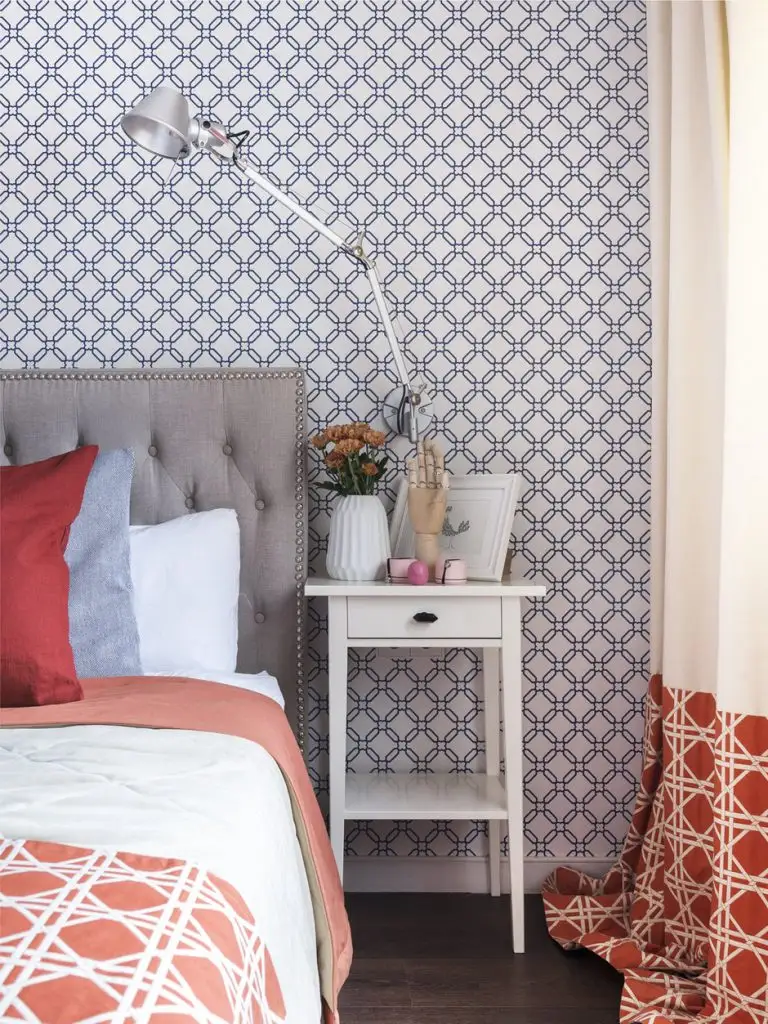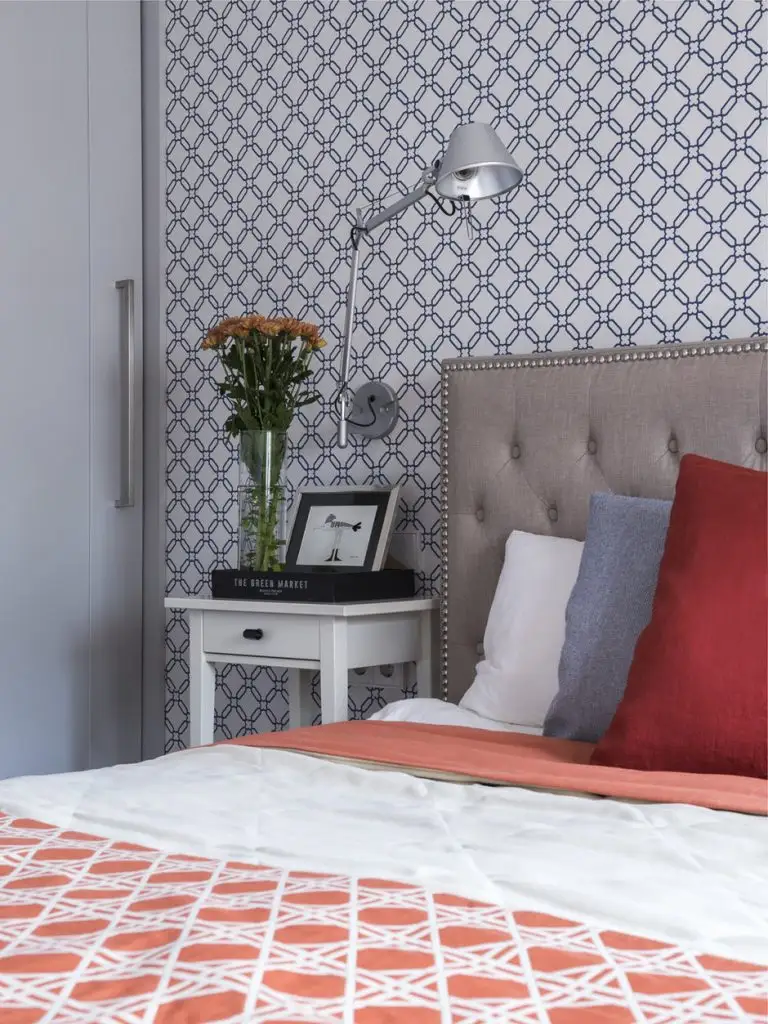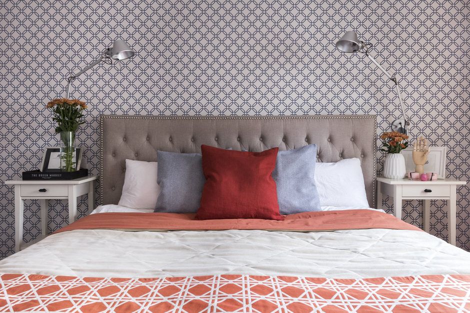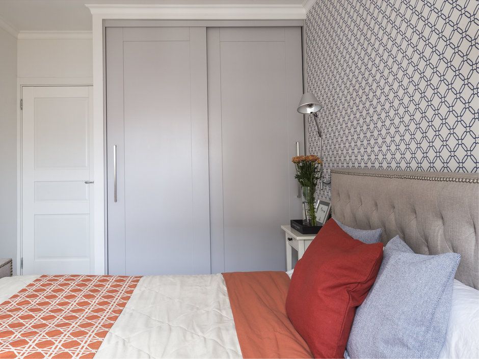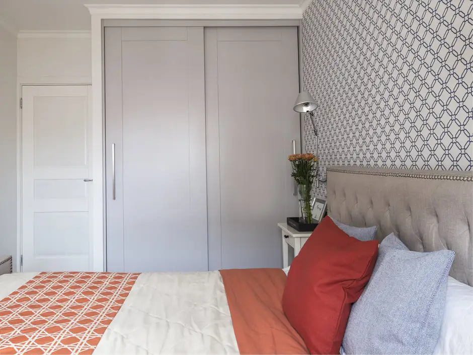 Dormitorul preia din cromatica zonei de zi; tapetul atrage atentia si ajuta la conturarea unui perete-accent potrivit unei astfel de incaperi. Tablia tapitata aduce un plus de confort, iar textilele se asorteaza cromatic. O parte din depozitare o regasim si pe hol, intr-o nisa folosita acum ca dressing.
